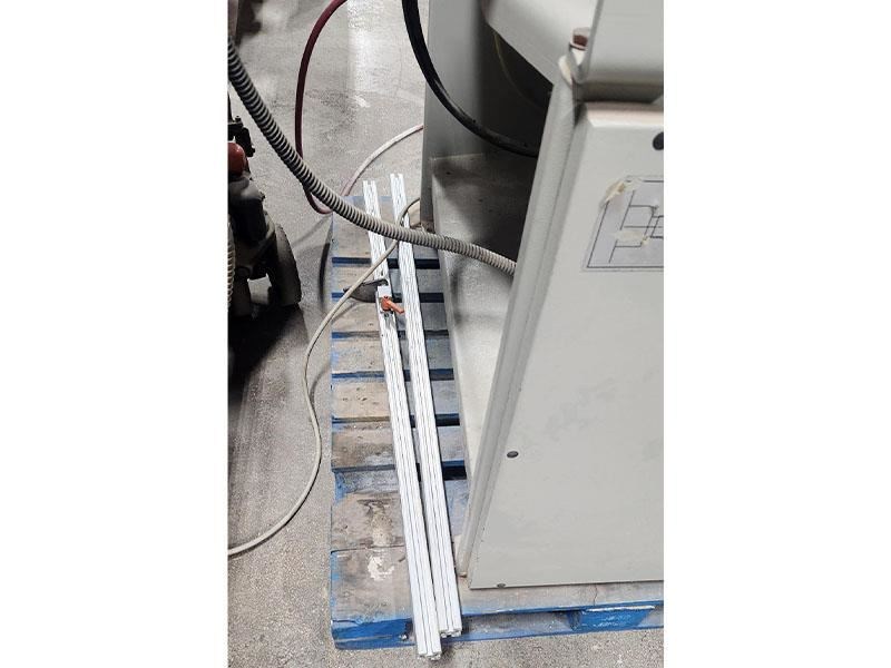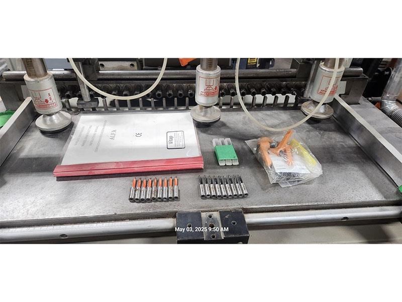 VITAP ALFA - 27: Construction/Line Borer27-Spindle boring head on 32 mm centers; drills vertically from bottom-up and head rotates to horizontal position for edge boring; head rotation is pneumatic with switch control. -- 2-3/4" Max. drilling depth; 2-1/2 HP - 2,800 RPM motor; pneumatic drill head advance with speed control; head height adjustment with mechanical digital readout; 34" x 20" table size; max. workpiece width 31-1/2". -- Equipped with: Left- & right-side fences for construction boring; (2) pneumatic holddown clamps; 118" line boring fence w/flip stops; pneumatic foot pedal control; magnetic starter; overload protection.