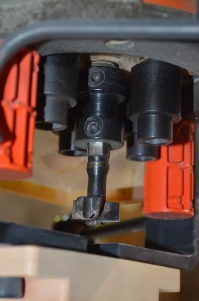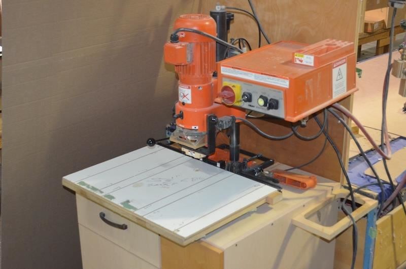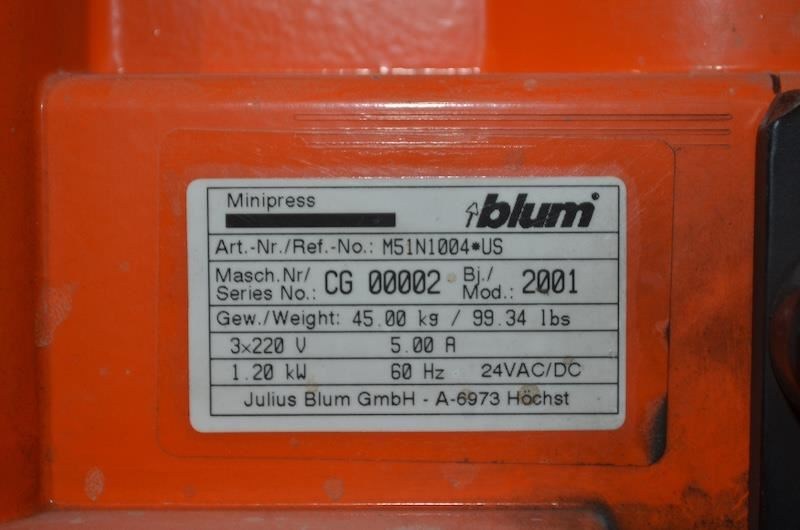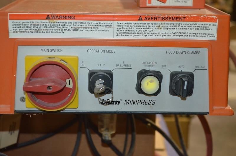 BLUM MINIPRESS P (M53N1004US) Bench-Top Hinge Boring MachineEquipped with: -- 1.1 kW (1-1/2 HP) - 3,275 RPM - 220/380 V Motor. -- Drill head assembly for hinge cup boring, Head assembly rotates for several hinge & drawer system boring patterns. -- Pneumatic drill cycle with Air blow off, Hold-down clamps.