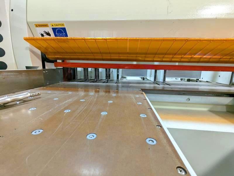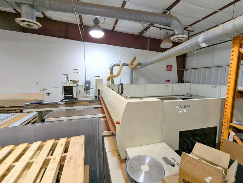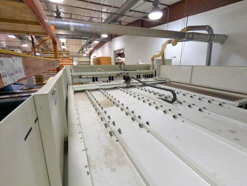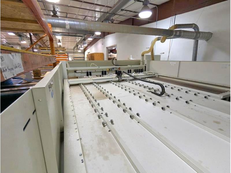 2005 SCM SIGMA IMPACT 105 PLM Panel SawSpecifications: -- Overall Foot Print - 19ft x 23ft÷Max cutting length and cutting width - 126". -- Max blade projection - 4.13"; max cutting height - 3.63"; machine cutting tolerances - +/- .006"; main saw motor - 18 HP (variable to 3800 RPM); main blade dia. - 15" (4300 RPM); scoring saw motor - 2 HP (eliminates chipping on bottom sheet); scoring blade dia. - 8". -- Equipped with: -- High Speed rack and pinion saw carriage - brushless A/C motor (saw carriage speeds 0-446 ft/min); pusher speeds 0-330 ft/min; automatic side aligner ensures tight cut tolerances (2.8 to 48" aligning zone); variable 0-3900 RPM; 19.5" wide rear phenolic table for cross cutting narrow strips; (1) 2' x 8' fixed front load air table; (2) 2' x 5' movable front load air tables. -- Complete with: -- Premium Plastic Configuration (7) clamps with thin plastic configuration, air cooling of the main blade with mist lubrication; pneumatic quick blade change - no tool required. -- Operating air pressure - 7 ATM (95 to 105 P.S.I); Dust extraction 2100-2800 CFM; Power - 80 amps @ 230 volts 3-phase, 60HZ (+/- 5% voltage); Dell PC, Windows XP; Win Cut Optimization software