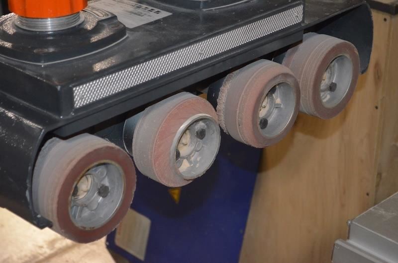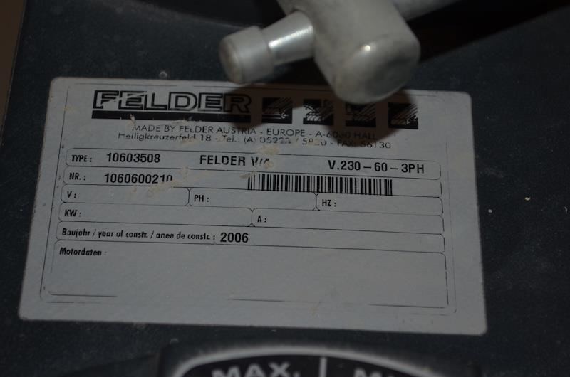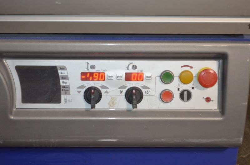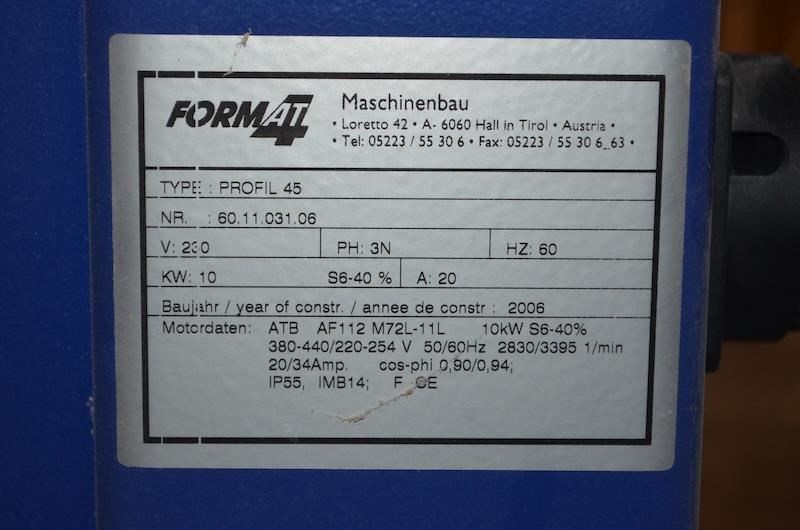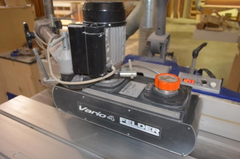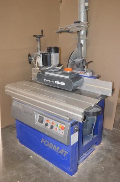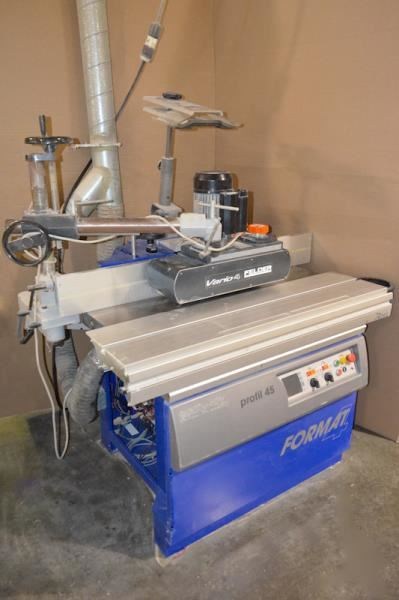FELDER FORMAT4 PROFIL 45, ...2" 12 HP Interchangeable Tilting Spindle Sliding Table Shaper, with Power FeederAllows Operator to store up to (99) programs of spindle heights & angles.Specifications: -- 12 HP Motor operates on 230 Volt / 3-Phase power. -- Motorized rise & tilt of spindle: Tilts back 45° & forward 5°. -- Motorized fence w/digital readout. -- Sliding Table with clamp. -- STEFF 3-Wheel Power Feeder w/WESTERN ROLLER soft wheels. -- AIGNER Integral fence and AIGNER CENTREX guard. -- Articulated arm to move Power Feed out of the way for large curved work. -- The fence is hinged, so it can be folded below the table, out of the way for doing large pattern work, as well.NOTE: Spindle does not currently function.