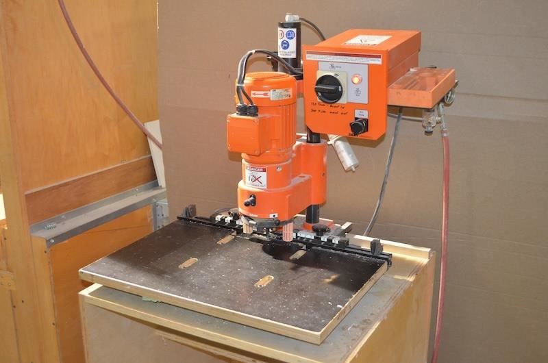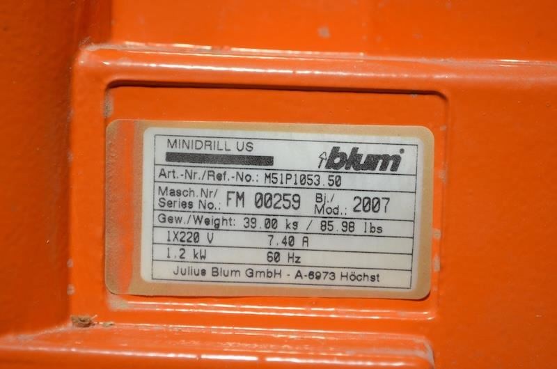 BLUM MINIDRILL (M51P1053.50) Bench-Top Hinge Boring MachineEquipped with: -- 1.2 kW (1-1/2 HP) - 3,420 RPM Motor. -- Drill head assembly for hinge cup boring, Head assembly rotates for several hinge & drawer system boring patterns. -- Pneumatic drill cycle with Air blow off.