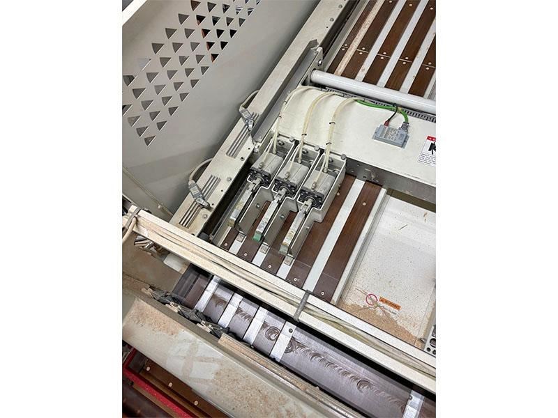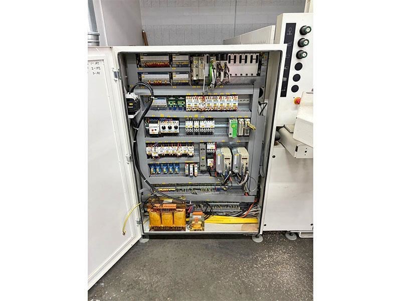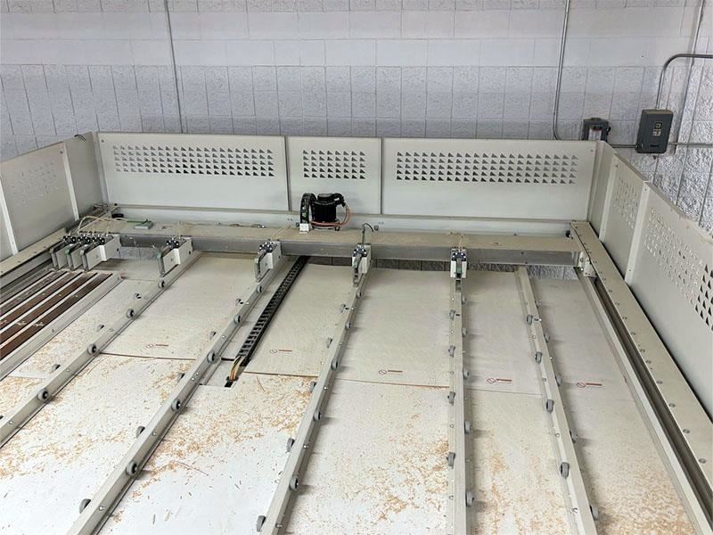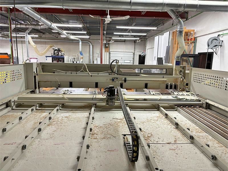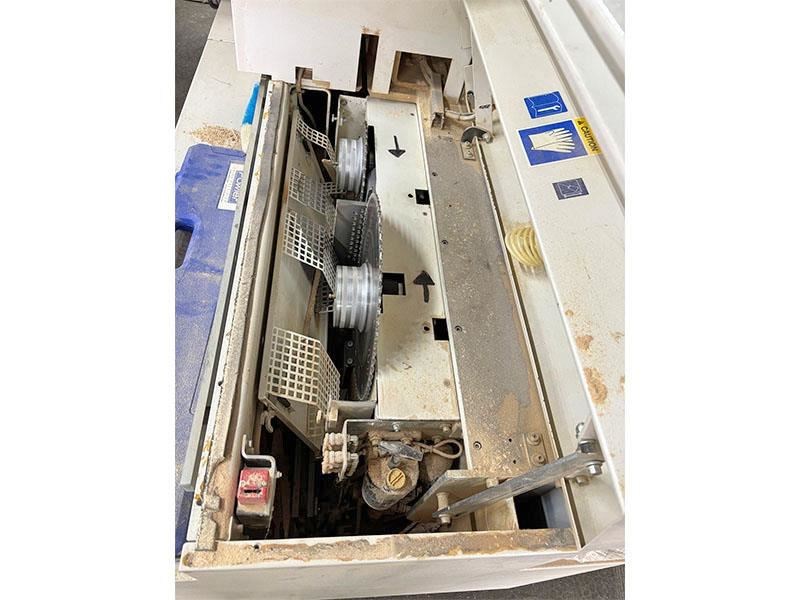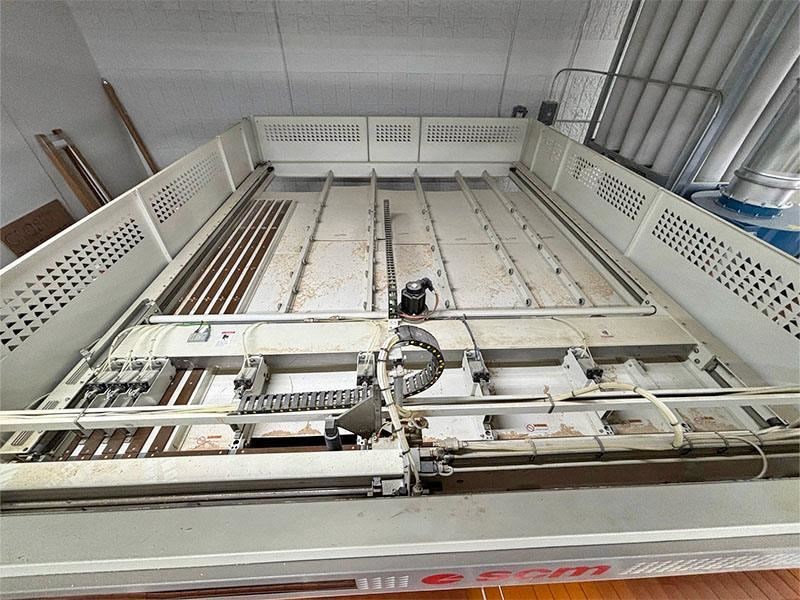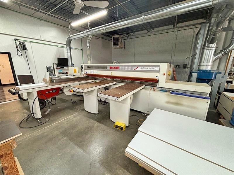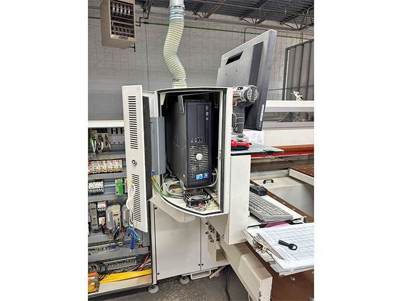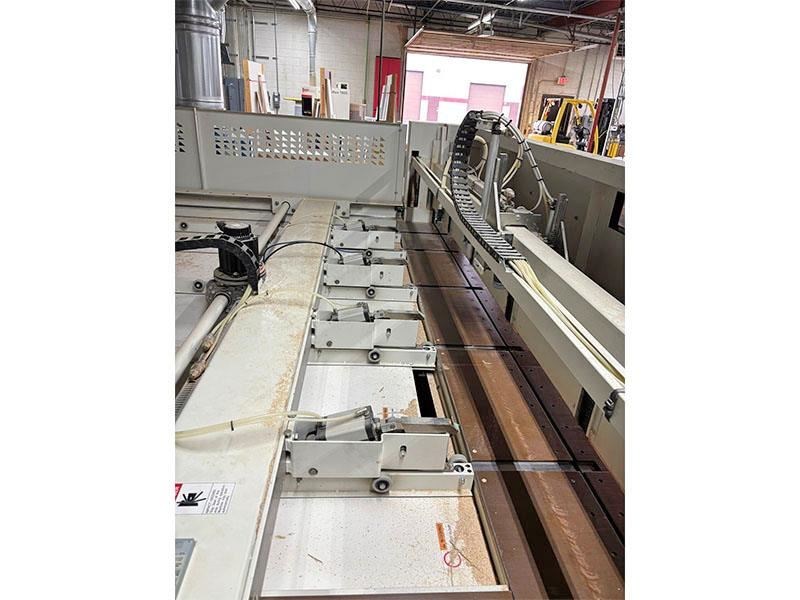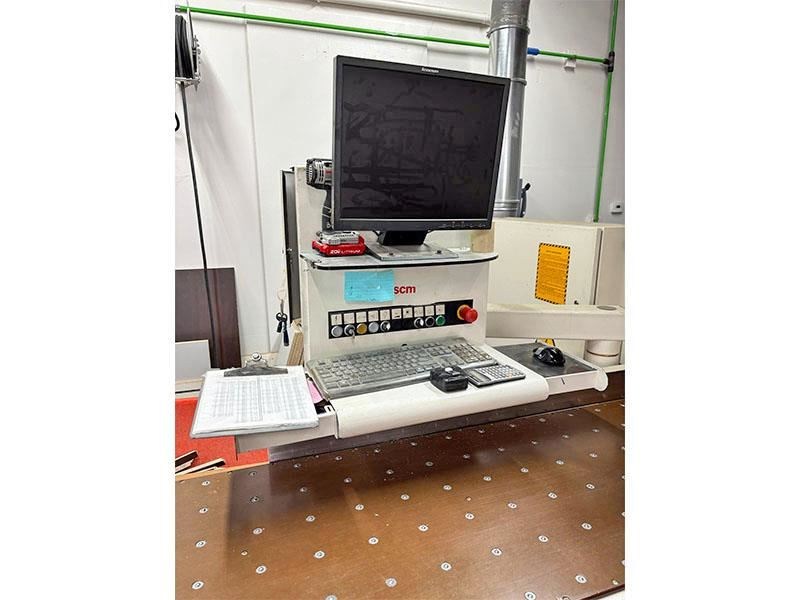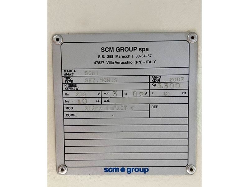 SCM IMPACT C Front-Load Panel Saw Working Capacity:149.6" (3,800 mm) max. rip cut, 149.6" (3,800 mm) pusher stroke, 4.33" (110 mm) saw blade projection;380 mm dia. Main blade with 80 mm bore & 200 mm dia scoring blade with 80 mm bore,17 HP (13 kW) Main saw motor, 3,900 RPM main blade speed, 2 HP (1.5 kW) scoring motor, 6,300 RPM score blade speed.Positioning Speed:Feed speed for saw carriage from 20 - 442 FPM (6 - 135 MPM), return speed of 442 FPM (135 MPM);Automatic saw carriage lubrication, balanced on hardened cylindrical guides, external score saw adjustment, THK guides for vertical saw movement.Pusher Fence:Programmable rear fence with rack & pinion movement, 78 FPM (24 MPM) forward speed, 262 FPM (80 MPM) return speed; (8) material gripper clamps, grippers fit into a slotted pressure beam for positive material control during the final cut.Operator & Machine Control: PC Front-end with 64 X2 Dual Core Processor 5000+ 2.60 GHz, 896 MB of Ram,15" Color super VGA monitor, on-screen diagnostics & production reports. SCM "WinCut" real-time operation software with onboard optimizer.
