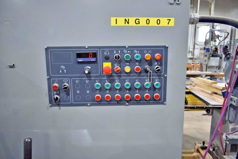 HOLYTEK MX-7S23 Through Feed Moulder:7-Head (B-R-L-T-T-B-U), working cap. 230 mm X 160 mm (9" x 6.3").Head sequence: -- Bottom 10 HP, right 10 HP, left 15 HP, top 15 HP, Top 15 HP , Bottom 15 HP and Universal 10 HP motor. -- Spindle dia. 40 mm with cutterhead speed of 6,000 RPM. -- Mechanical digital readouts, "Dual mechanical" readouts on all spindles.Mechanical readouts for pressure elements and chipbreakers; all chipbreakers and pressure elements with pneumatics. -- Feed works: Inverter driven, 10 HP inverted feed system with feed speed 6 - 36 Meter/min (20 - 117 FPM). -- Infeed table 2M (6'6"), chromed tables and fences. Side pressure roller mounted at infeed. -- Phenolic insertion on second top spindle -- Pneumatic chip breaker on top head -- Universal head with inverted electric height adjustment Includes: -- Central lubrication, automatic table lubrication pump, side pressure roller mounted to infeed table, and sound enclosure.Net weight 12,500 lbs