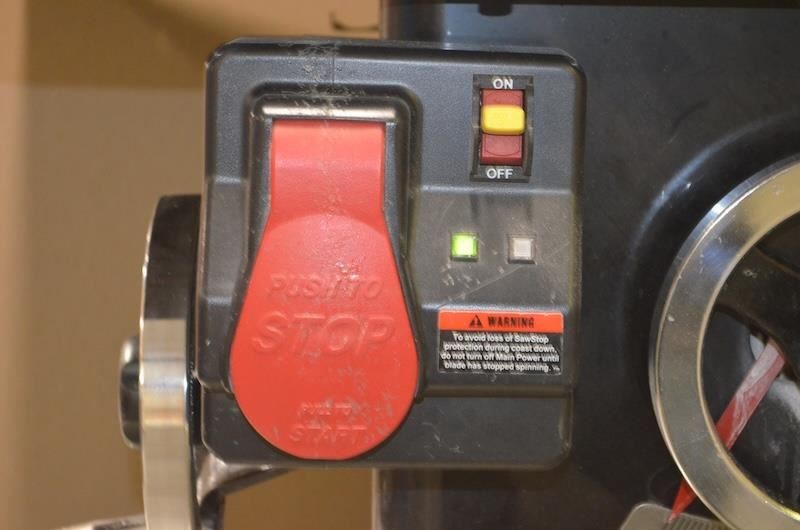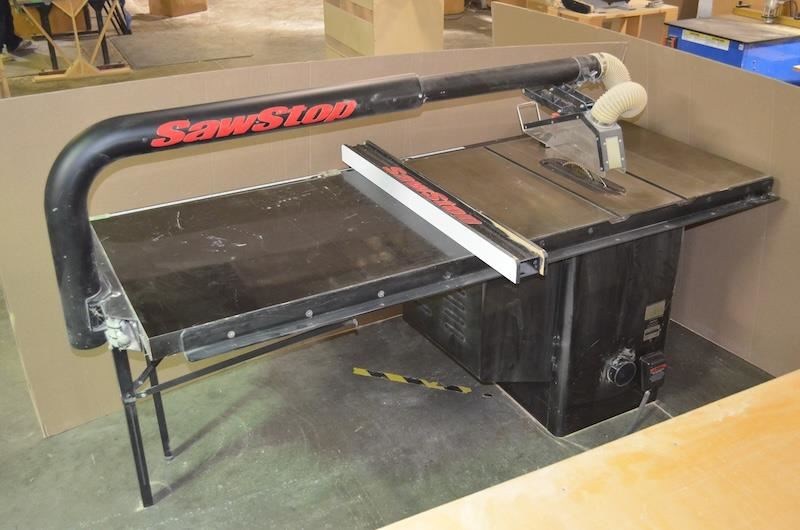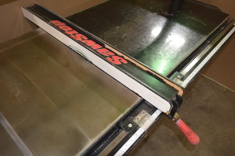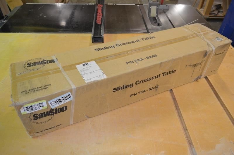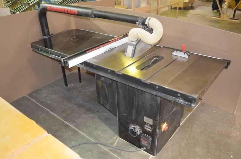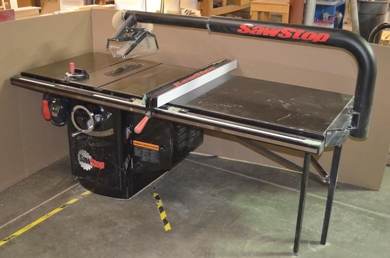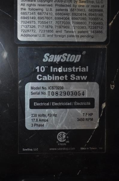 SAWSTOP ICS 73230 Table Saw w/Famous Safety "Stop Feature" & New Sliding Crosscut Table.10" Blade cap., 7-1/2 HP - 3,450 RPM motor, 3-1/8" depth of cut @ 0°, 2-1/4" depth of cut @ 45°, 13/16" max. dado width, 5/8" arbor dia, 30"; FB x 24"; LR Table, with 45° Left tilt, & 10"; Left & Right extensions. -- FEATURES: Enclosed cabinet, heavy-duty belt drive, cast iron trunnions, and SAWSTOPS's revolutionary flesh detecting safety mechanism. -- Includes: Rip fence with 52" Right & 12" Left Rip cap., side support table and laminated top, 4" Dust collection port, magnetic contractor motor control, main power switch with removable lock-out key, New SAWSTOP "TSA-SA48" 48" Sliding Crosscut Table, & Accessories (As pictured).Actual model ICS 73230.