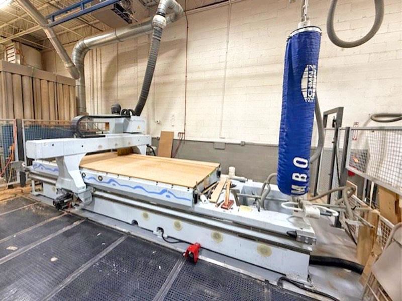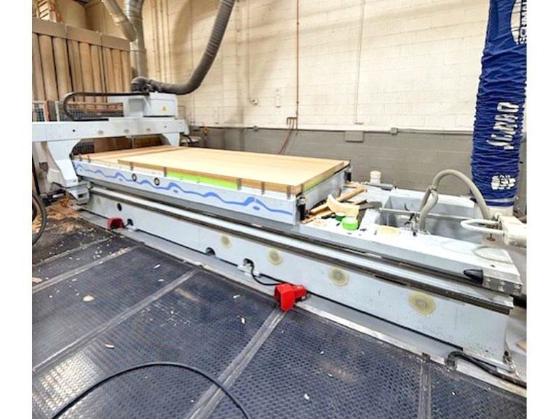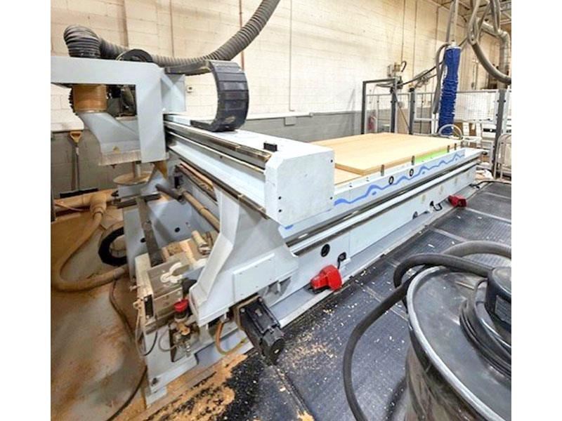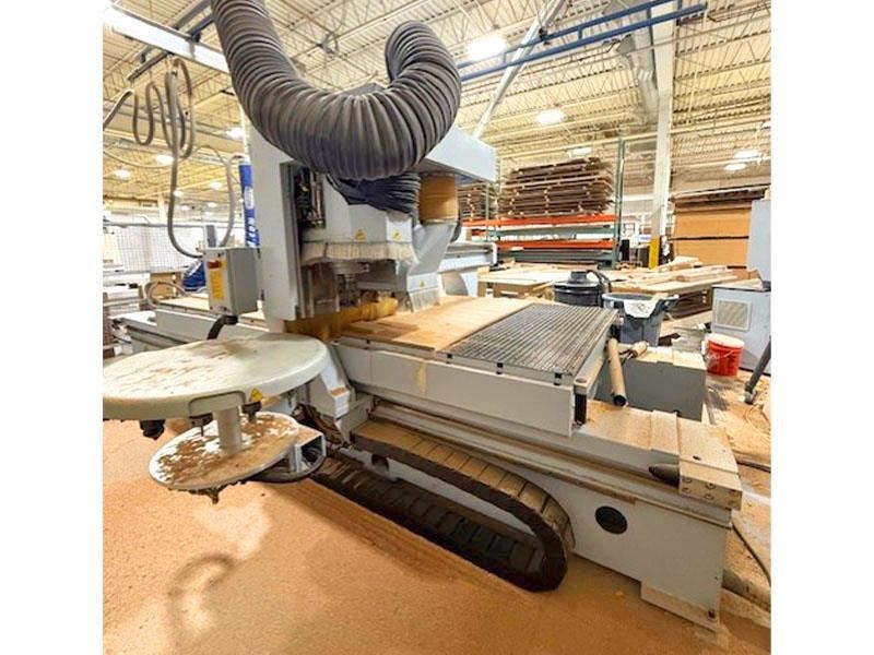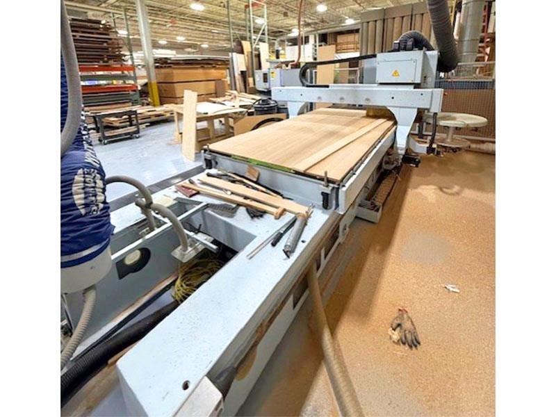 WEEKE VANTAGE 36L (W/BORING/ATC/"C" AXIS): -- Specifications:5' x 12' Bridge style gantry machine; working area cap. "X" Axis is 3,700 mm (145.7"), "Y" axis is 1,550 mm (61"); "Z" axis stroke of 185 mm (7.3"); max. material thickness is 3.9" (100 mm).The head travels on THK linear motion guides on all axes; positioning speed in "X" & "Y" axis is 345 FPM (105 MPM); "Z" axis is 66 FPM (20 MPM). -- Work Table: User-Friendly MATRIX grooved Phenolic vacuum table. The working field can be accessed with all processing units without restriction.(16) pneumatically lowerable workpiece stops, including electrical surveillance of lower cylinder position. -- Boring Unit:With 3.6 HP (2.7 kW) Motor, programmable variable speed from 1,500 - 7,500 RPM; (10) independent vertical spindles.(1) 3-way horizontal spindle head with (1) horizontal spindle in "Y" axis & (1+1) horizontal spindle in "X" axis.(1) NC controlled 0° - 90° "X/Y" grooving Saw with max. 125 mm dia blade; -- Machining:Equipped with: (1) 12 HP (9 kW) High speed constant duty, variable speed electro spindle Router, HSK F 63 adaptor.NC controlled "C" axis for 360° horizontal processing, programmable from 1,250 - 24,000 RPM, RH or LH rotation.(1) 14-Position ATC plate located on the machine head for "on the fly" ATC. -- Operator Interface:PC Front-End with: PC 85T + WoodWop 5.0 + Windows "XP"; 17" TFT color graphic monitor, keyboard for data entry; hand control pendant.CD R/W & floppy drives, EtherNET interface for LAN connection to office PC, RS-232 serial interface, and USB ports. BECKHOFF Programmable logic control for (3) axes; linear, circular & helical interpolation.The controller is contained in a separate free-standing, "air conditioned", dust-free control cabinet, which can be placed at either the LH or RH side of the machine. -- WoodWOP 5.0 can be programmed off-line with the same intuitive icon driven software that the operator has on the machine controller. -- Equipped with: (1) 500 m³/Hr Vacuum Pump; safety mats (machine will stop machine if operator enters work area), safety fence, and separate control cabinet. -- Actual model is WEEKE VANTAGE 36L OPTIMAT BHP".