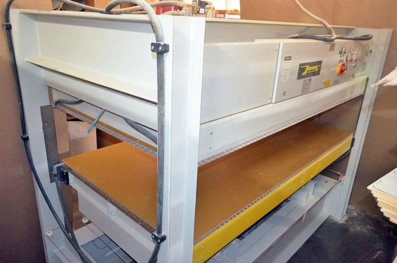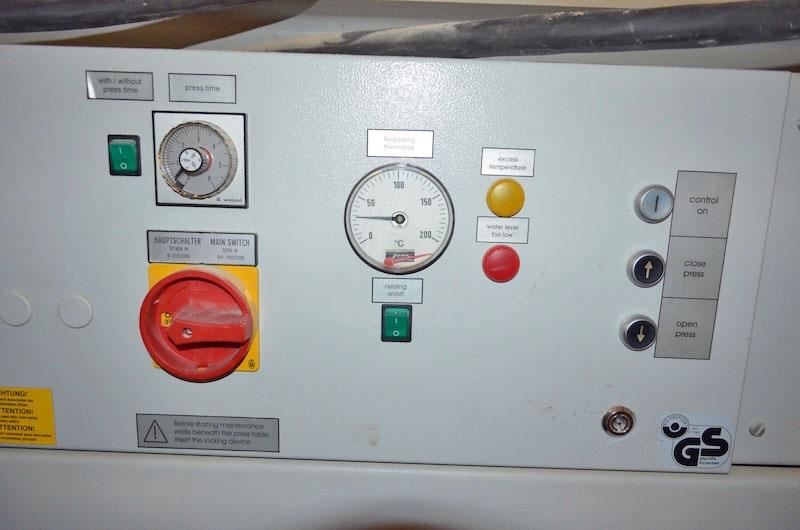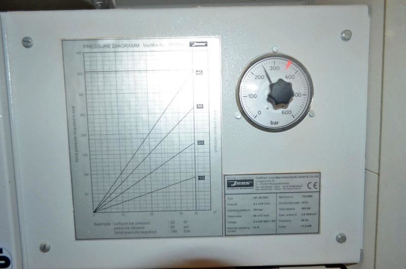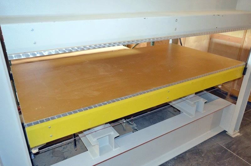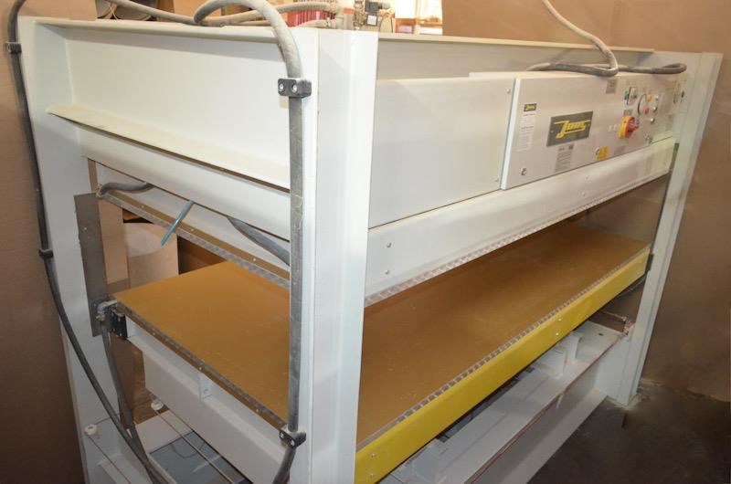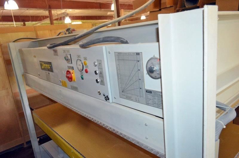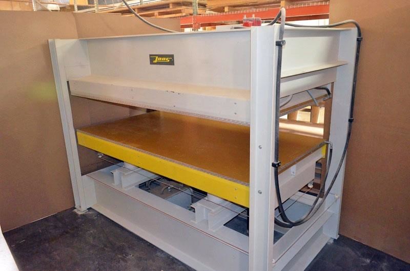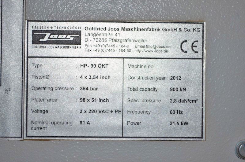 JOOS HP-90 Hot PressPlaten size 51" x 98", load from all sides, 90 metric tons of pressure,Features: -- PLC control of press functions, (1) upper & (1) lower "OKOTHERM" short cycle electrically heated glycol/water platens, tempered gold anodized platen surfaces to prevent glue build up and scratches. -- TOOL-TEMP Heater used for heating both platens. Recommended Maximum Platen Temperature is 110° C (220° F) -- 36 PSI specific pressure over the entire platen, (4) 80 mm dia. upstroke cylinders, 15" stroke.Complete with: -- 2-Stage 1.2 kW hydraulic high-pressure pump, patented ABS parallel safety closing system (If the press is loaded improperly the hydraulics stop preventing damage to the press.