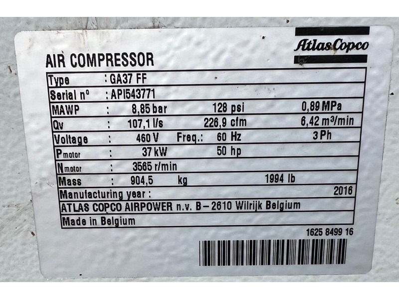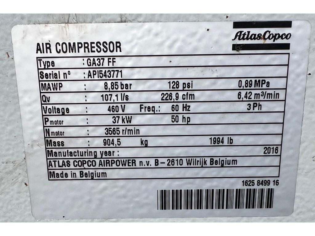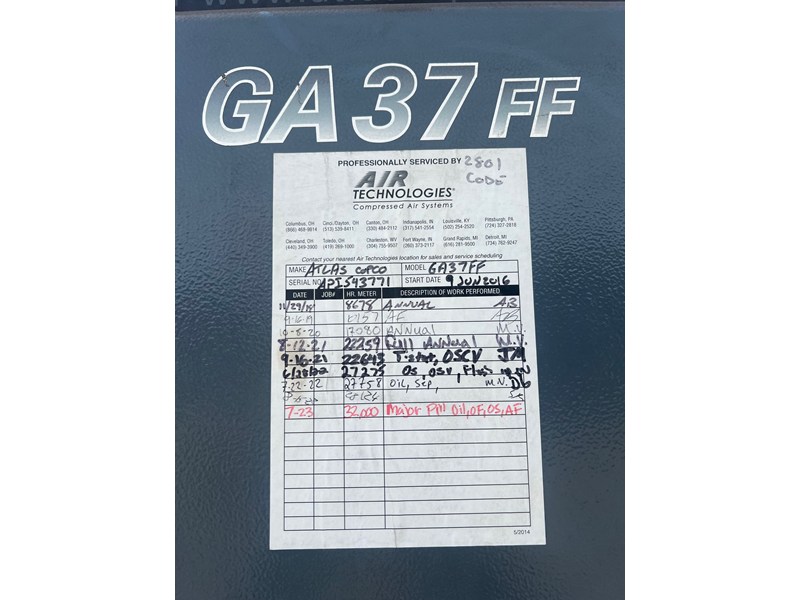 2016 GA37FF 50 HP screw compressor with built-in dryer. Compressor was removed from Snap-On facility in working condition with regular service.