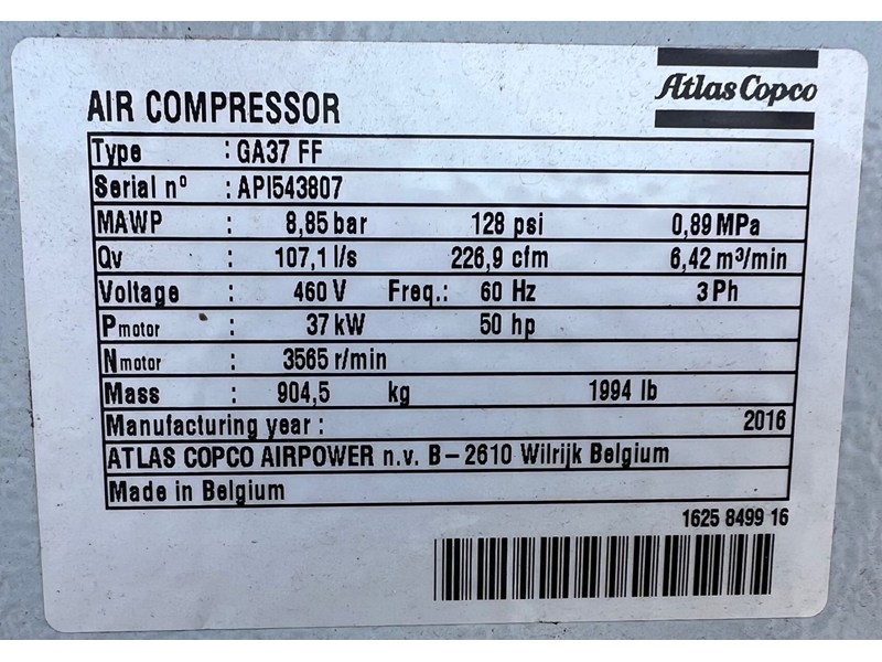2016 Atlas Copco GA37FF Air Compressor