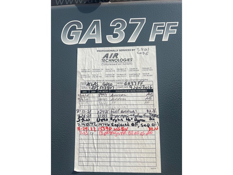 2016 GA37FF 50 HP screw compressor with built-in dryer. Compressor was removed from Snap-On facility in working condition with regular service. Low Hours!