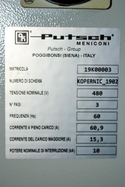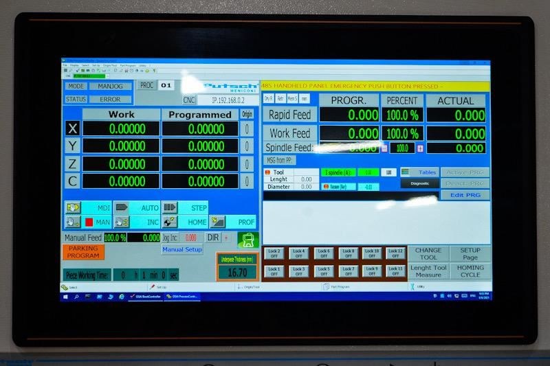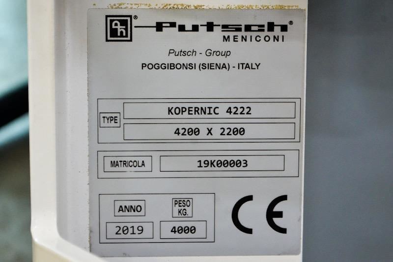 PUTSCH-MENICONI KOPERNIC 4,200 x 2,200 mm CNC Vertical Machining Center, New with Parts Warranty, ATC, & C-AxisSpecifications: -- Working area X-Axis 4,200mm (165.35";), Y-Axis 2,220 mm (86.61";), & Z-Axis 100 mm (3.94";). -- Min. panel size 300 x 300 mm (11.81"; x 11.81";). -- Positioning speed: X-Axis 45 MPM (147 FPM), Y-Axis 30 MPM (98 FPM), & Z-Axis 15 MPM (49 FPM).Equipped with: -- Inclined Bakelite working table, with 20° Angle with respect to vertical, (12) Independently controlled vacuum zones with Solenoid valves with EtherCAT module & Digital vacuum pressure switch, and (10) Horizontal, (1) Left vertical & (1) Right vertical retractable pneumatic stops. -- Rack & pinion drive system on X & Y-Axes, with Automatic guide lubrication. -- Brushless motors, with EtherCAT Bus drives on All axes. -- Air pressure regulator, with digital pressure gauge. Machining: -- HSD 8 kW (10-3/4 HP) - 24,000 RPM ISO30 Air-cooled electro-spindle, with ER32 20 mm (0.79";) Chuck, High frequency inverter, & Variable spindle speeds to 24,000 RPM. -- CNC-Controlled C-Axis with 360° Rotation. -- Pneumatically actuated suction hood. -- 12-Position Automatic tool changer, with Automatic preset zero tool length probe.Control: -- OSAI “OPEN SMART CNC Control, with 21-1/2"; Display, EtherCAT Bus, USB & Ethernet ports, & MICROSOFT “WINDOWS 10"; Operating system. -- Remote pendant control.Complete with: -- Electrical Cabinet Cooling System. -- BECKER 6.6 kW (8.85 HP) 250 m³/h Vacuum Pump, with inverter for vacuum pressure adjustment from control. -- (6) ISO 30 Tool holders & (6) ER32 Clamps. -- 90° Grooving Cutter & HSD Shank for C-Axis Aggregate. -- 80 mm (3.15";) Cutter for shaving spoil board.Options available at additional cost: -- 150 mm (5.91";) Dia. Circular Tools for C-Axis Aggregate. -- 135° V-Grooving Cutter. -- Z48 Saw Blade.