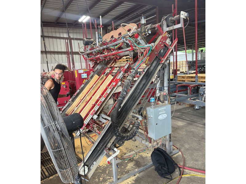Standard Woodpecker Junior | Board stops and flushers | Single Operator | Pallet Stacker with Electronic Counter | 10 ft. rollout conveyor for completed stacks | 54" L x 56" W Pallets | 500 Pallets per Shift