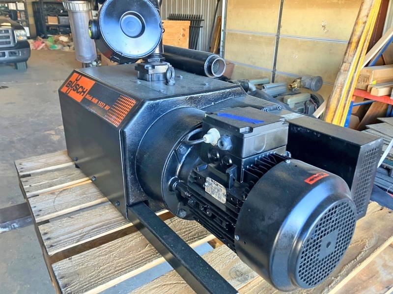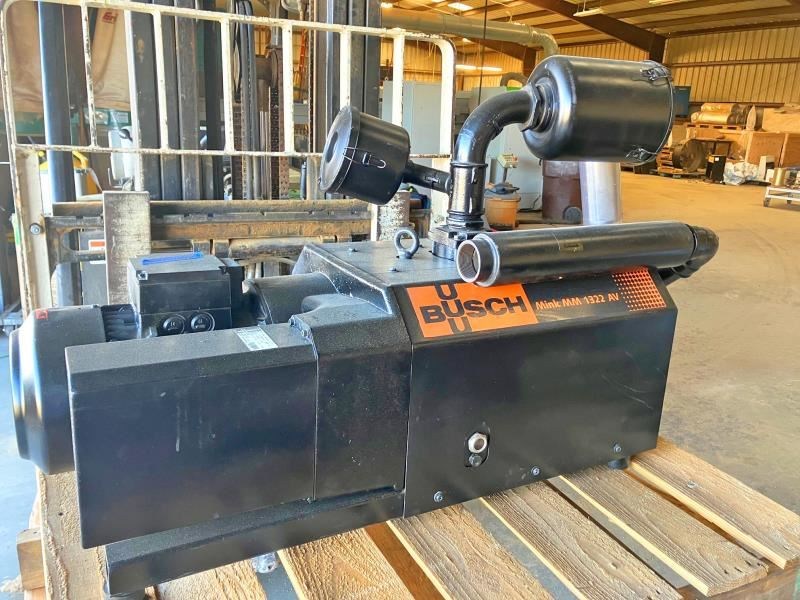 BUSCH MINK MM 1322 A VV8 VACUUM PUMP, ROTARY (DRY CLAW): -- Specifications:360 m³/Hr., Dry Rotary Claw Vacuum Pump, Model: MM 1322 A VV8. Nominal pumping speed displacement 212 ACFM; Ultimate pressure 112.5 TORR; Nominal motor rating 10.9 HP; Nominal motor speed 3,600 RPM.Noise level (ISO 2151) 82 dB(A); Weight approx. 655 Lbs.; Dimensions (L x W x H) 46.9 x 21.5 x 17.9 inches; Gas inlet/outlet, 2" / 1¼" NPT. -- Industry Uses:Woodworking Handling devices, Drying, handling robots, Clamping on CNC routers, Pneumatic conveying.