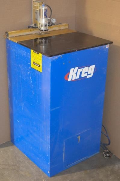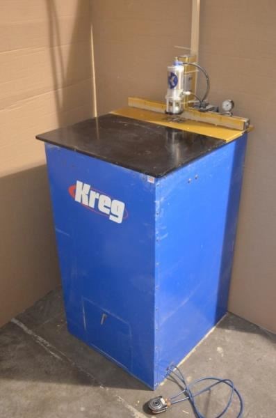KREG DK-1100 Pocket Hole Boring Machine1.5 HP direct drive electric motor; 40" table top working height; (0.5 - 1) Sec cycle time. -- Drills the pocket hole with a 3/8" dia. step bit in (1) smooth operation. The bit is supported all the way to the workpiece by a hardened steel drill guide that ensures tear-out free holes and consistent placement in virtually any material. -- Features: 15° Boring angle for greater stability, reduced screw breakout & splitting. This produces a smaller "flat bottom" pocket hole with rounded sides that can be plugged with a dowel if desired. Includes: -- Pressure gauge -- Hold down tower -- Foot pedal actuation