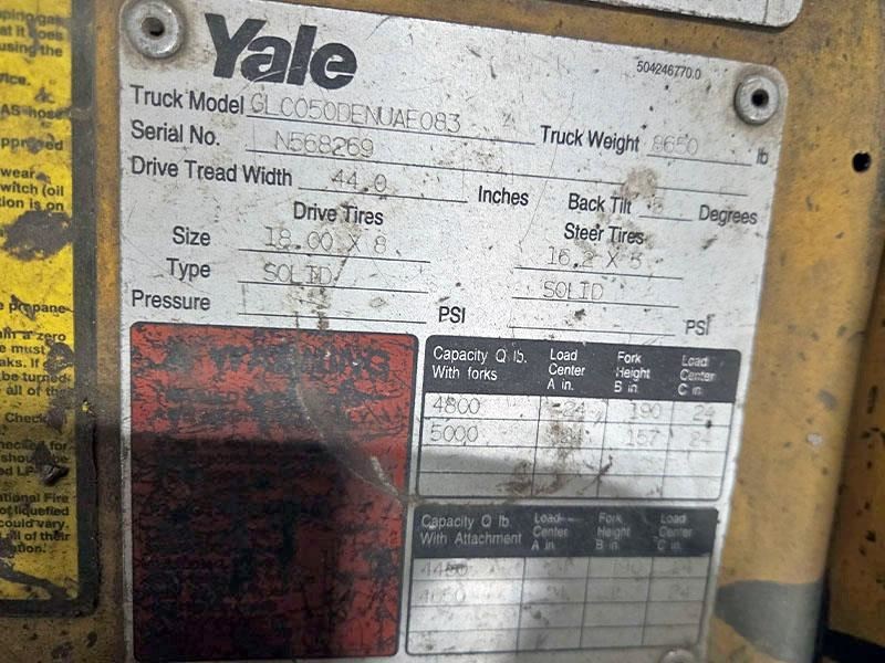 5,000 Lbs Cap. at 24" load center, LP gas powered, automatic transmission; 3-stage mast, 83" overall lowered height, 189" max. extended fork height. -- Equipped with: Power steering, overhead guard, load back rest, pneumatic tires, strobe, and lights. - Full Model # is "GLC050DENA083"NOTE: REQUIRES REPAIR, WATER PUMP/HEAD GASKET. Quote from local company $2,000.