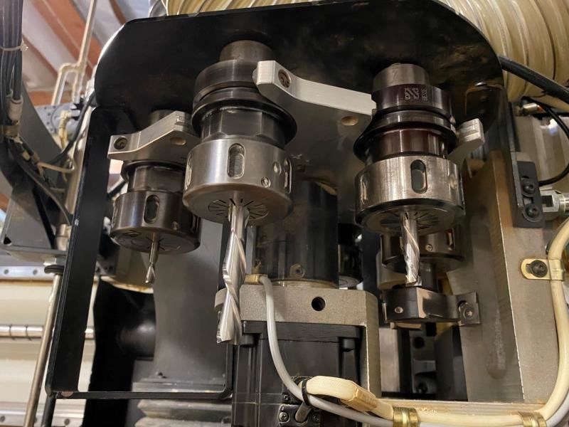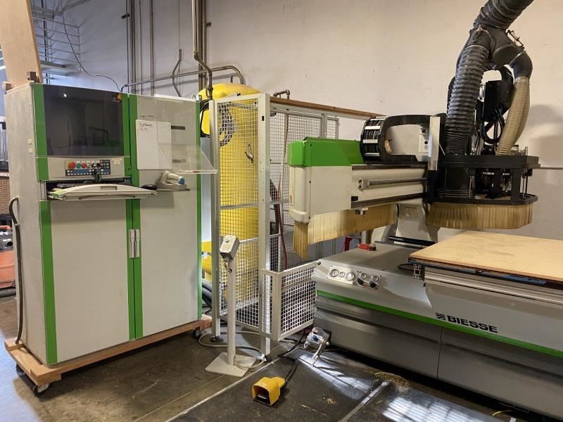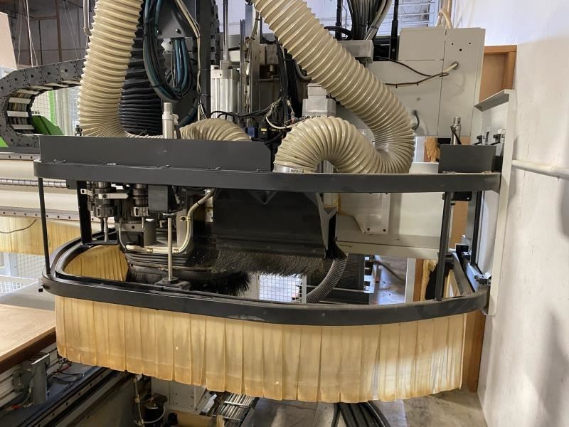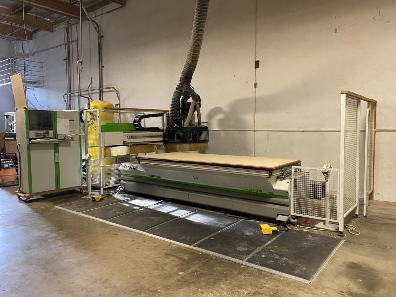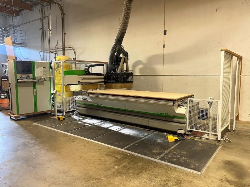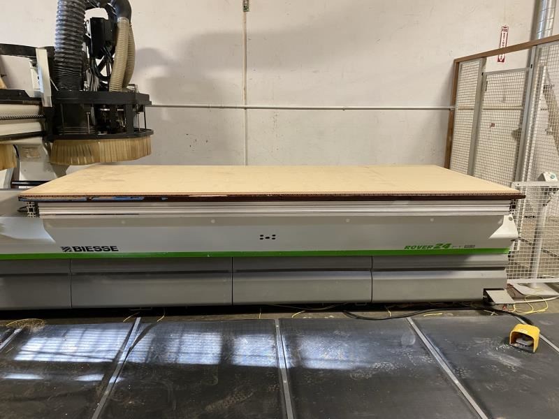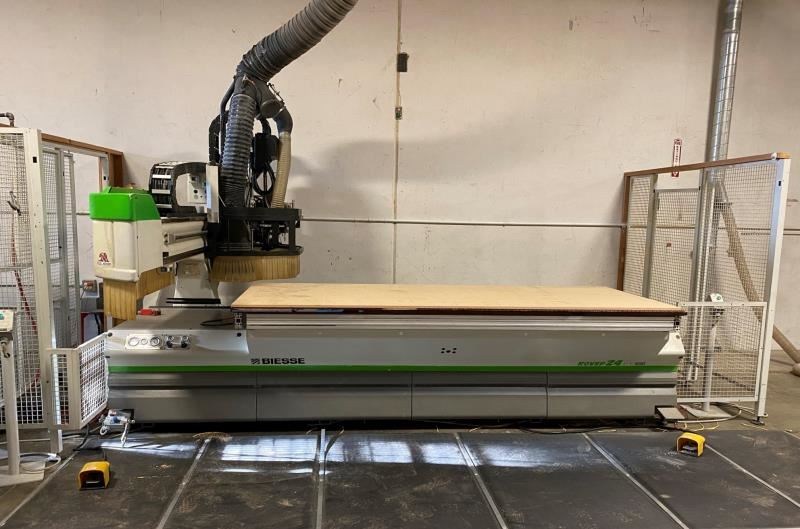 BIESSE ROVER 24 FTS FLAT TABLE MACHINE (W/ATC/BORING): -- Specifications: 4' x 10' Flat table design for "Nested Base" processing: Working cap.: X-Axis is 122" (3,100 mm), Y-axis is 49" (1,250 mm), Z-axis is 6.1" (155 mm). -- Worktable:Phenolic "MATRIX" grid vacuum table for FT "Nesting" or single part processing using (optional) pods or jigs; (2) side & (4) rear pop-up pins for easy material location. -- Positioning Speed:X- & Y-axis 262 FPM (80 MPM), Z-axis 98 FPM (30 MPM); "X-axis uses a helical rack & pinion system, Y- & Z-axis use precision ball screws; all axes movement is on precision linear guides & ways & controlled by digital, brushless AC Servo motors; all motion components are maintained by an automatic lubrication system. -- Boring Unit:(1) 4 HP (3.3 kW) - 4,000 RPM motor: (14) independent vertical spindles, (7) in X-axis & (7) in Y-axis; (6) horizontal drills with (2 + 2) in X-axis & (1 + 1) in Y-axis. -- Machining:(1) 16 HP (12 kW) Liquid-cooled vertically mounted HSD electro-spindle router with HSK F63 adaptor, inverter driven 1,000 - 20,000 RPM with max. torque from 12,000 - 20,000 RPM; (1) 6-position "Ride Along" Automatic tool changer for "on-the-fly" ATC. -- Operator & Machine Control:PC Front End with: BIESSE "XP600 + WINDOWS" XP-operating system; 15" color CRT; 40 GB hard drive; full keyboard & mouse; Ethernet connection capabilities; programs can be transferred via diskette or downloaded by wire; built-in 1,500 W air conditioner for constant temperature & dust-free environment. -- Complete with: 11 KVA Stabilized autotransformer for voltages between 220 - 600 V; automatic "forced" lubrication system for guides & ball screw; emergency stop rope & pressure sensitive safety mats that will instantly place machine in "pause cycle" when stepped on; sound absorbing protective head enclosure with debris curtain around bottom edge. -- NO Vacuum Pump is included but let us know if needed we can source a good used unit.