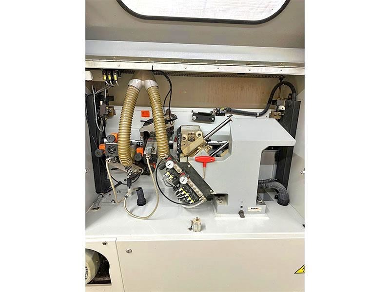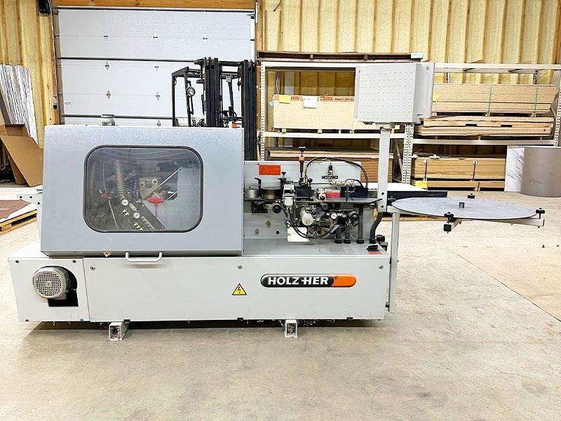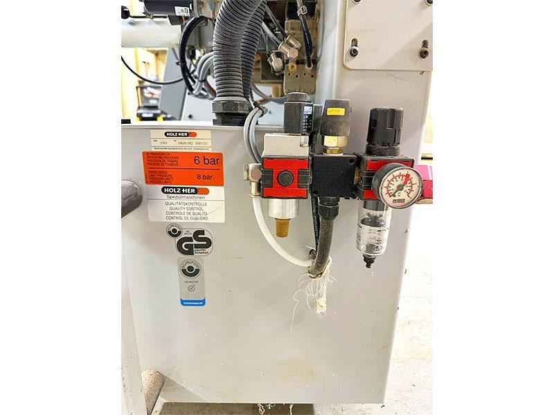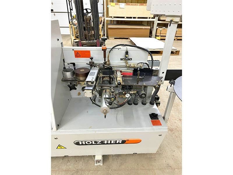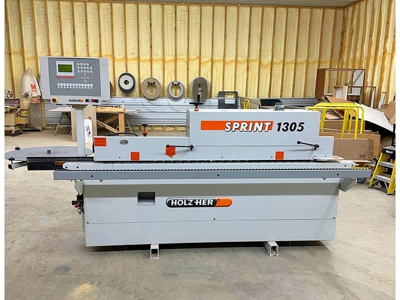 HOLZ-HER 1305-1 COMPACT EDGEBANDER 3 mm edge thickness cap., Cartridge glue system (1906M), automatic magazine coil & Strips (1903), 3 mm PVC cap. pneumatic guillotine for coil cutoff. -- Workstations: Double motor end trim (1822), chamfers 0° - 10° (0.22 kW - 9000 RPM motor, HF - 300 Cy); Universal Top & bottom fine trim (1942M), for bevels from 0° - 15°; (1 HP (0.6 KW) - 22,000 RPM motor ea., HF - 300 Cy). -- Single feed speed 26 FPM (8 MPM). -- PLC (Programable Logic Control) for easy setup & program storage. - INCLUDES: (1) used saw blades on end trim station, & used insert knives on each of the cutterheads on flush trimmer. - ACTUAL MODEL: "SPRINT 1305".