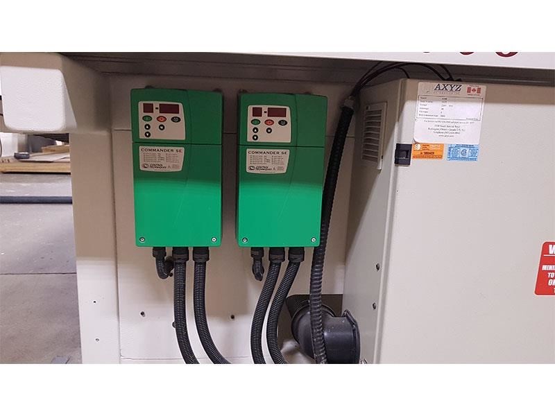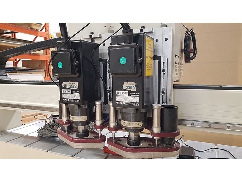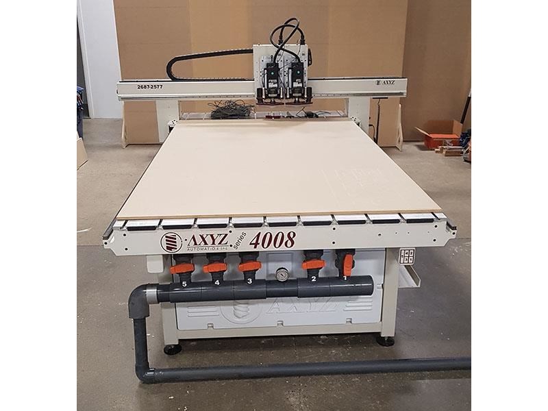 --AXYZ SERIES 4008 CNC 5X8 Router With Two Spindle Heads. Moving gantry style machine in a front-to-back configuration with stationary table, approx. 60" X 97" process area; Z-axis with 6" gantry clearance and 10" ball screw; max. speed 1,000 IPM. -- Aluminum table with multi-zone vacuum, complete with internal plumbing and gages; T-slot fixturing capability when spoil board is removed; heavy duty gantry bridge rides on double drive integral rack & pinion system. -- Equipped with: (2) Italian made ELTE 5 HP wrench-type spindles, variable RPM from 6,000 to 24,000 RPM each with a COMMANDER SE A/C inverter. -- Control system using AXYZ AWC0004G processor using 7-segment motion profile for high speed complex calculations; 2 Gig onboard memory, ethernet connection. -- Includes the AXYZ "Tool Path Interface", and hand-held pendant is a user friendly WINDOWS PC based control system with over (75) operator programmable functions, and can run DXF, HPGL and G-Code file formats. -- Comes complete with Tool Height Sensor, documentation, software, and manuals. -- Electrical supply 220/3/60, 30 Amps , 9 KW Total Load. Ontario Hydro and CSA approved. -- NO VACUUM PUMP IS INCLUDED.
