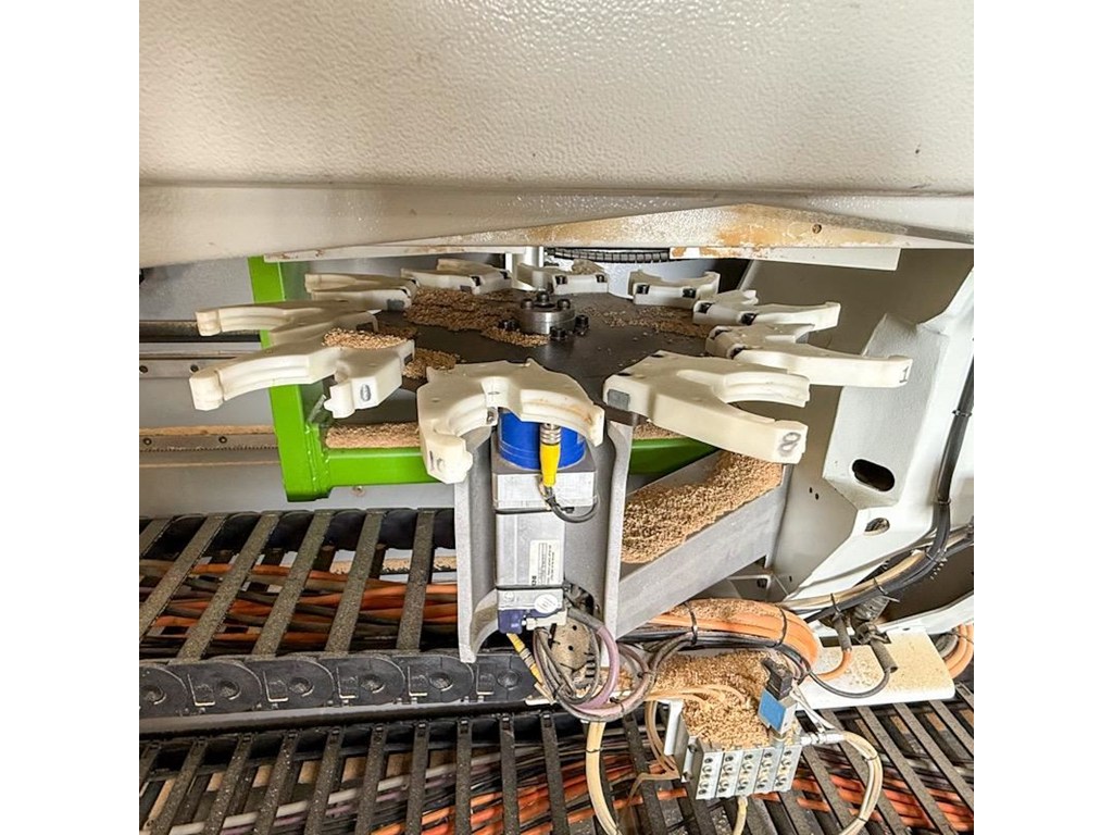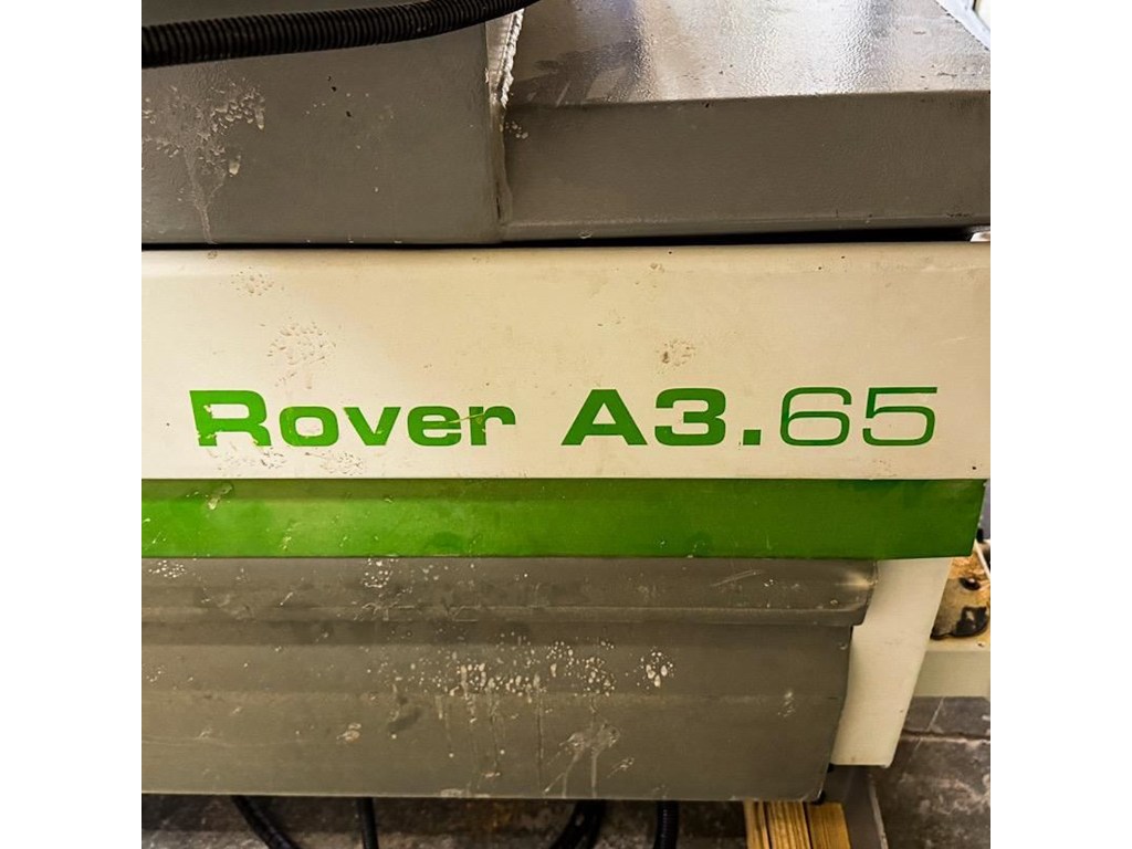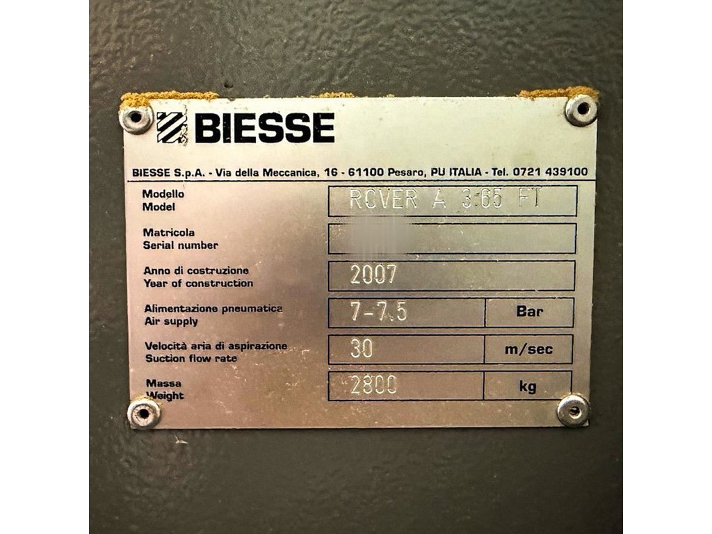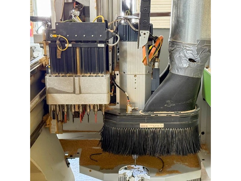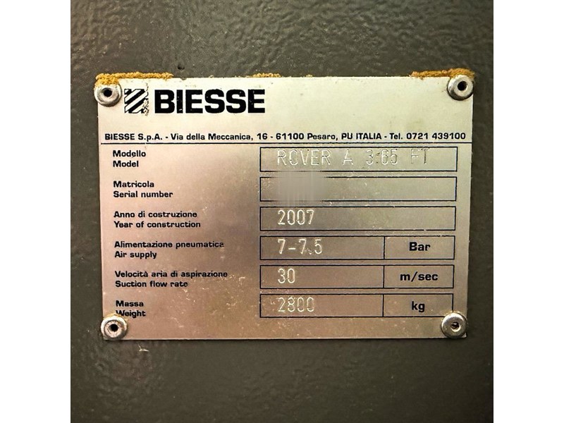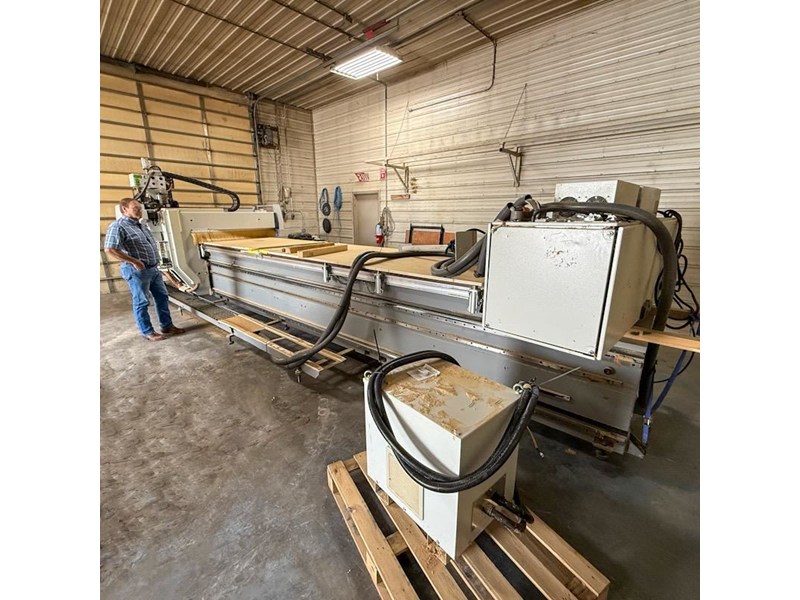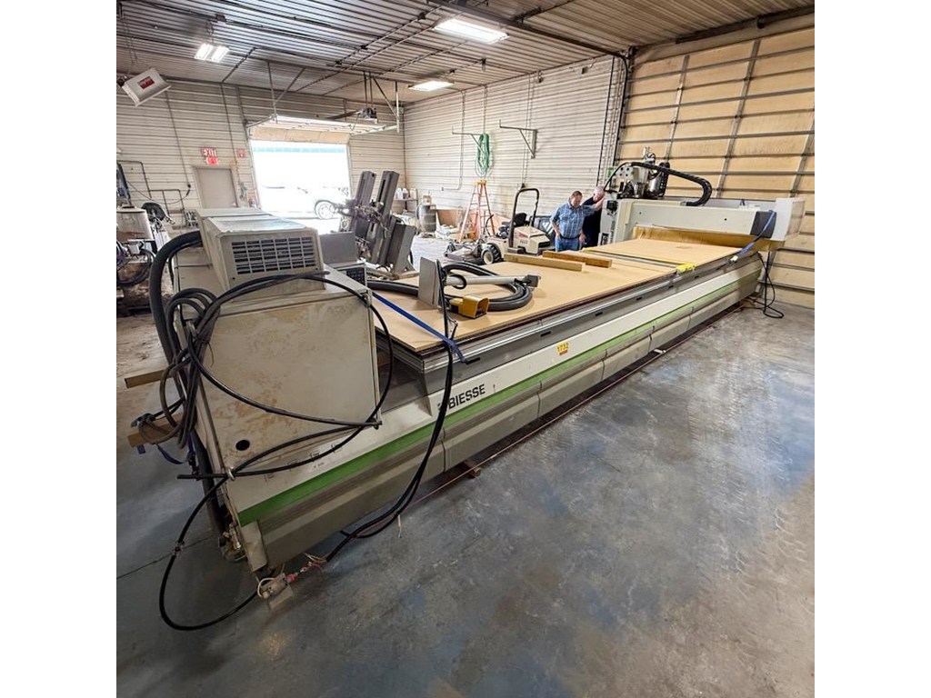 BIESSE - ROVER A 3.65 FT: Flat Table Machine (w/ATC/Boring) -- Specifications4' x 21.3' with (2) 10' Long Flat Table Workstations: "GANTRY TYPE" "Phenolic" Table machine for Nested Base Manufacturing. -- Working Capacity"X" Axis: 254" (6,450 mm); Any unit; "Y" Axis: For routing; 51" (1,290 mm); "Y" Axis: Vertical drilling, 57" (1,436 mm); "Z" Axis: Stroke, 7.9" (200 mm); max. material thickness: 6.2" (160 mm). -- Positioning Speed"X" & "Y" Axis: 262 FPM (80 MPM); "Z" Axis: 82 FPM (25 MPM); helical rack & pinion drive on "X" Axis; ball screw: "Y" & "Z" Axis. -- WorktableFlat table designed for: "Nested Base Manufacturing", (2) independent vacuum zones and working areas.(16) External pop-up reference pins with: (2) On RH side; (2) on the LH side; plus (6) on the front of the table & (6) on the back of the table.Prepared for (optional); "Quick fit" vacuum outlets for optional clamping of small or awkward shaped parts; each work zone with: (1) "Quick connect" vacuum outlet for custom vacuum fixtures. -- Boring UnitBoring Head with: (7) Independent vertical boring spindles in "X" axis. -- Machining(1) 16.1 HP (12 kW) Liquid-cooled electrospindle with: HSK F63 Adaptor; 14 kW inverter; 1,000 - 24,000 RPM with max. torque from: 12,000 - 24,000 RPM.(1) 10-Position "Ride-Along"; gantry mounted automatic tool changer. -- Operator InterfacePC Front-end with: BIESSE "XP600" + "BiesseWorks" + Windows "XP Professional" Operating System; 15" color monitor; international keyboard; soft touch keypad; Industrial mouse; RS-232 serial port; (1) 1.44 MB; CD ROM disk drive.BiesseWorks: Easy Operating System for real-time multitask processing; programs can be transferred via diskette or downloading by wire (is possible).Components housed: 1,500-Watt Air conditioner control cabinet for constant temperature control & dust free environment. -- Complete with:(1) 300 cbm/Hr Vacuum pumps; centralized manual lubrication system for guides & ball screw; safety mats; Emergency Stop rope; protective head enclosure with debris curtain around bottom edge. -- Actual Model: BIESSE ROVER A 3.65 FTNOTE: Machine runs, was in use until taken from production. It has had occasional program stoppage mid run, once reset runs well quite a few cycles before stoppage.