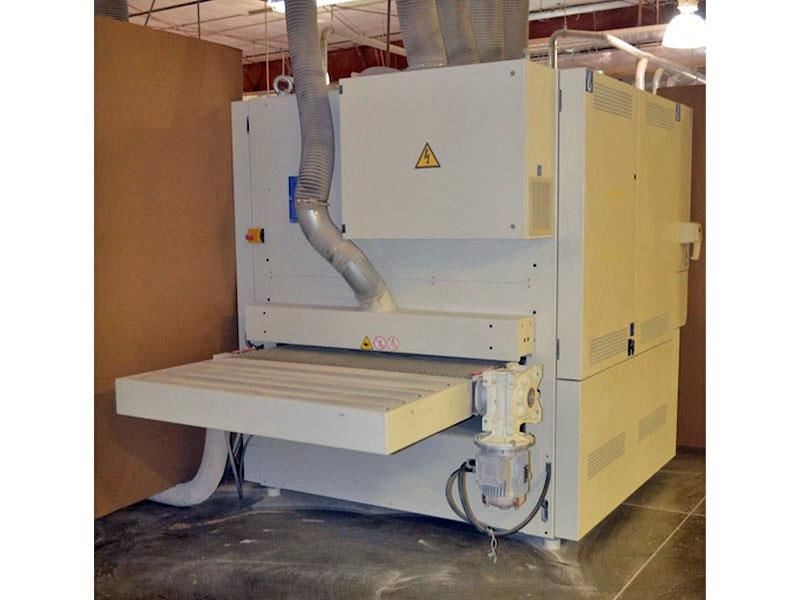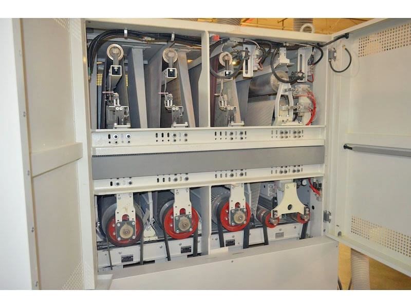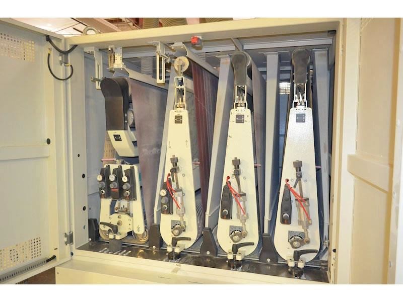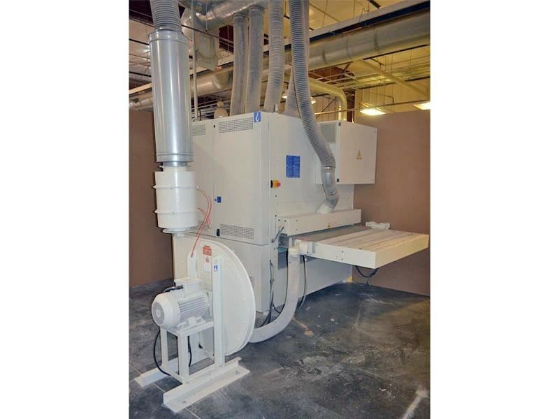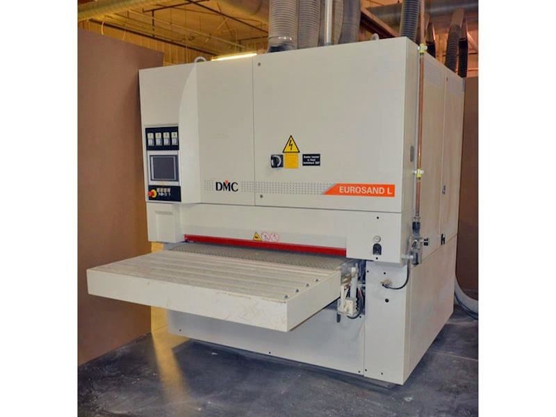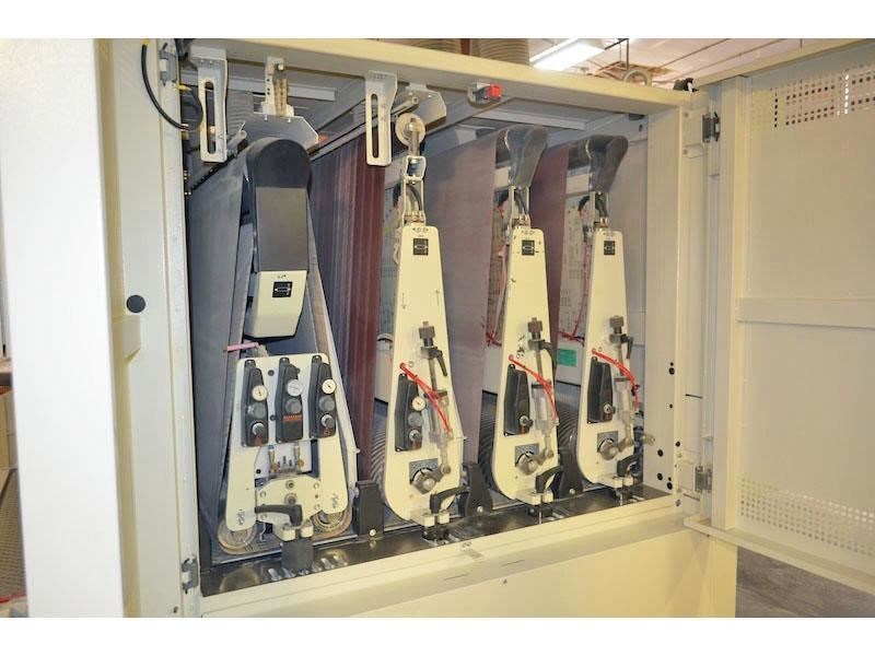 D M C EUROSAND L ERL 1350 M4 ...53" Wide Belt Sander with (4) Sanding Heads: 1,350 mm (53") Max. working width, equipped with (3) Contact Rolls, and (1) "Superfinishing" Segmented Platen Head.Head Configuration: -- 1st Head: Steel Contact Roller, spirally grooved, 250 mm (9.8") diameter; 26 kW (35 HP) motor. Pneumatically operated grit compensation. -- 2nd Head: Rubber Contact Roller, spirally grooved, approx. 85° Shore hardness, 250 mm ( 9.8") diameter; 22 kW (30 HP) motor. Pneumatically operated grit compensation. -- 3rd Head: Rubber Contact Roller, spirally grooved, approx. 45° Shore hardness, 250 mm ( 9.8") diameter. 3-speed motor 12 / 15 / 17 kW (16 / 20 / 23 HP). Pneumatically operated grit compensation. -- 4th Head: "Superfinishing" Segmented Polishing Platen with inner Chevron belt. With "PE 45 EPICS" (Electronic Pad Independent Control Stroke) - electronically controlled, segmented pressure pad with (45) pneumatically activated segments, each 30 mm (1.2") wide. The EPICS-system allows imperfections in the panel of up to 2 mm (1/16"). Driven by 2-speed motor 15 / 18 kW (20 / 25 HP) motor. -- 5th Position: (2) Oscillating Air Jet blowers for panel cleaning.All heads use abrasive belt size 2,620 x 1,370 mm (103" x 54"), and are equipped with electronic abrasive belt tracking, and pneumatic belt tensioning. Feed System with 900 mm (35-7/16") Constant pass line: -- Vacuum bed assembly to ensure flatness of parts and feeding of small & lacquered panels. -- Variable feed speed 4 - 19 m/Min (13 - 62 FPM), with 7,5 kW (10 HP) feed motor. -- Motorized thickness opening 4 to 170 mm (3/16" - 6.7") and Automatic thickness adjustment. -- Pneumatically operated conveyor belt tracking. Holddown shoes for the first three heads, rubberized rollers in the platen area.Machine Management System: -- Front-mounted control console with B&E "HYDRA V-PAD" 17" colour touch-screen monitor. NC-computer control and management of all machine functions. Storage capacity for (120) different sanding programs. -- Sanding heads with computer setup and adjustment, light indication of panel movement, thickness, and features maintenance indicator.Complete with: Roller table extensions front & back (28" each), Emergency stops front & back, Load meters, oversized parts and infeed protection. Includes dust extraction manifold. CE Compliant - Approx. weight 11,000 Lbs (5,000 kG)Actual model is D M C EUROSAND L ERL 1350 M4 ... Wide Belt Sander with (4) Sanding Heads