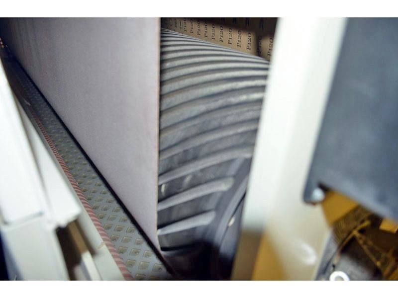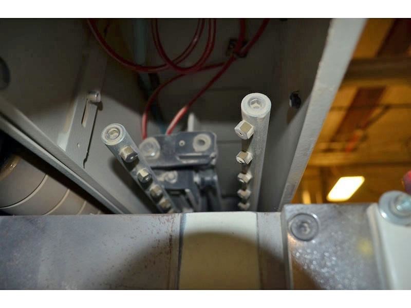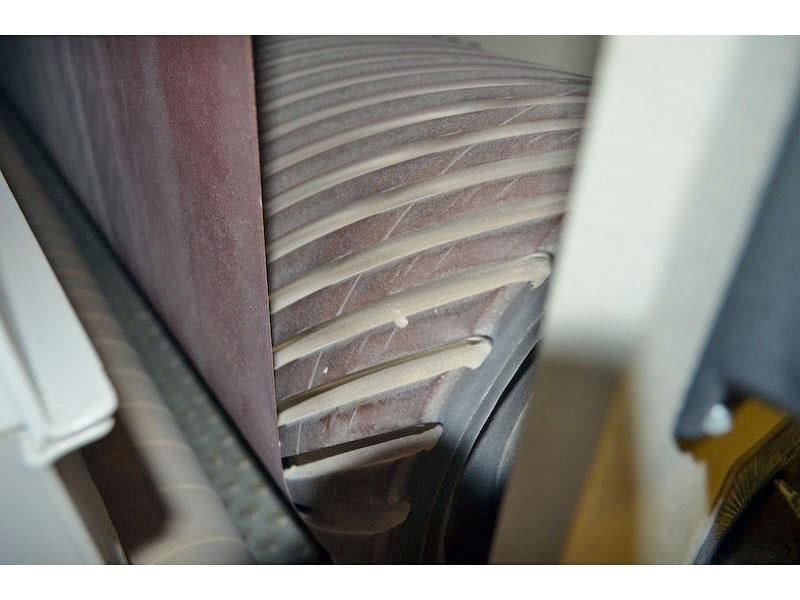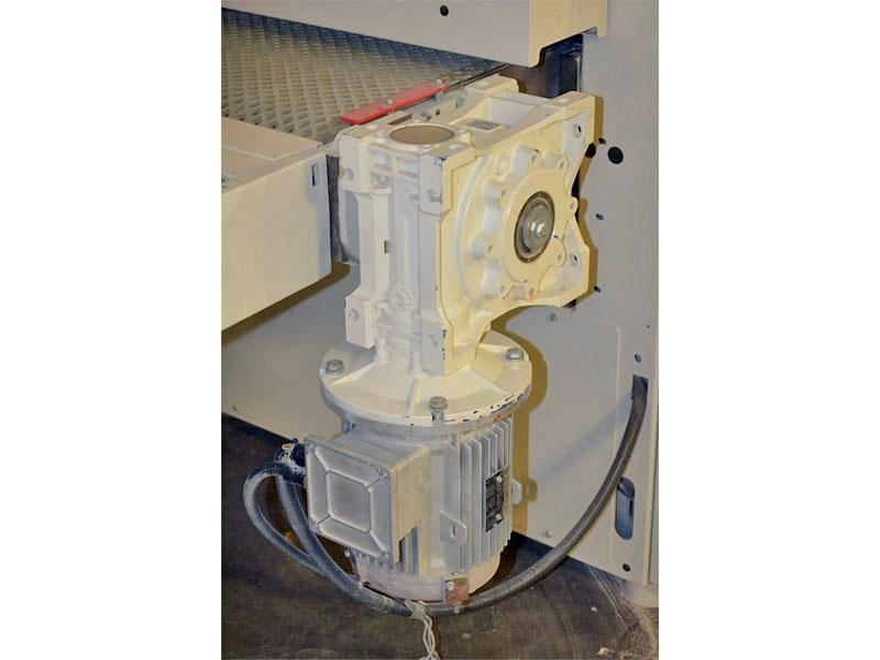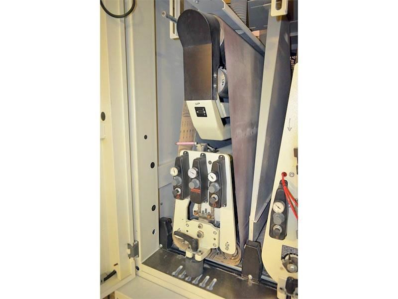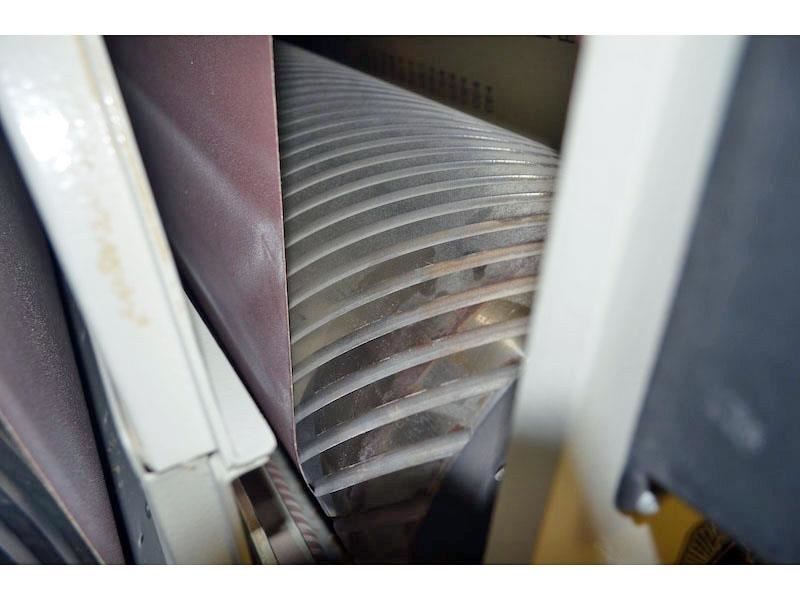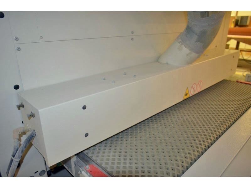 D M C EUROSAND L ERL 1350 M4 ...53" Wide Belt Sander with (4) Sanding Heads: 1,350 mm (53") Max. working width, equipped with (3) Contact Rolls, and (1) "Superfinishing" Segmented Platen Head.Head Configuration: -- 1st Head: Steel Contact Roller, spirally grooved, 250 mm (9.8") diameter; 26 kW (35 HP) motor. Pneumatically operated grit compensation. -- 2nd Head: Rubber Contact Roller, spirally grooved, approx. 85° Shore hardness, 250 mm ( 9.8") diameter; 22 kW (30 HP) motor. Pneumatically operated grit compensation. -- 3rd Head: Rubber Contact Roller, spirally grooved, approx. 45° Shore hardness, 250 mm ( 9.8") diameter. 3-speed motor 12 / 15 / 17 kW (16 / 20 / 23 HP). Pneumatically operated grit compensation. -- 4th Head: "Superfinishing" Segmented Polishing Platen with inner Chevron belt. With "PE 45 EPICS" (Electronic Pad Independent Control Stroke) - electronically controlled, segmented pressure pad with (45) pneumatically activated segments, each 30 mm (1.2") wide. The EPICS-system allows imperfections in the panel of up to 2 mm (1/16"). Driven by 2-speed motor 15 / 18 kW (20 / 25 HP) motor. -- 5th Position: (2) Oscillating Air Jet blowers for panel cleaning.All heads use abrasive belt size 2,620 x 1,370 mm (103" x 54"), and are equipped with electronic abrasive belt tracking, and pneumatic belt tensioning. Feed System with 900 mm (35-7/16") Constant pass line: -- Vacuum bed assembly to ensure flatness of parts and feeding of small & lacquered panels. -- Variable feed speed 4 - 19 m/Min (13 - 62 FPM), with 7,5 kW (10 HP) feed motor. -- Motorized thickness opening 4 to 170 mm (3/16" - 6.7") and Automatic thickness adjustment. -- Pneumatically operated conveyor belt tracking. Holddown shoes for the first three heads, rubberized rollers in the platen area.Machine Management System: -- Front-mounted control console with B&E "HYDRA V-PAD" 17" colour touch-screen monitor. NC-computer control and management of all machine functions. Storage capacity for (120) different sanding programs. -- Sanding heads with computer setup and adjustment, light indication of panel movement, thickness, and features maintenance indicator.Complete with: Roller table extensions front & back (28" each), Emergency stops front & back, Load meters, oversized parts and infeed protection. Includes dust extraction manifold. CE Compliant - Approx. weight 11,000 Lbs (5,000 kG)Actual model is D M C EUROSAND L ERL 1350 M4 ... Wide Belt Sander with (4) Sanding Heads