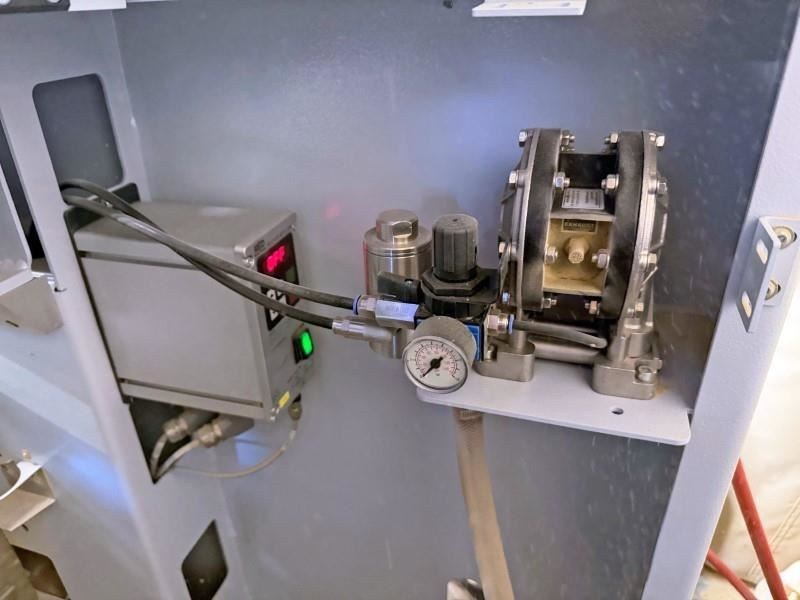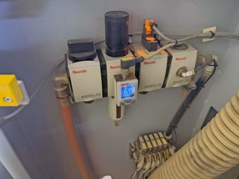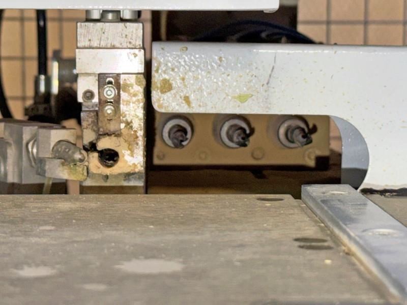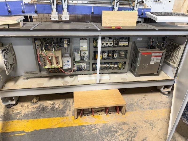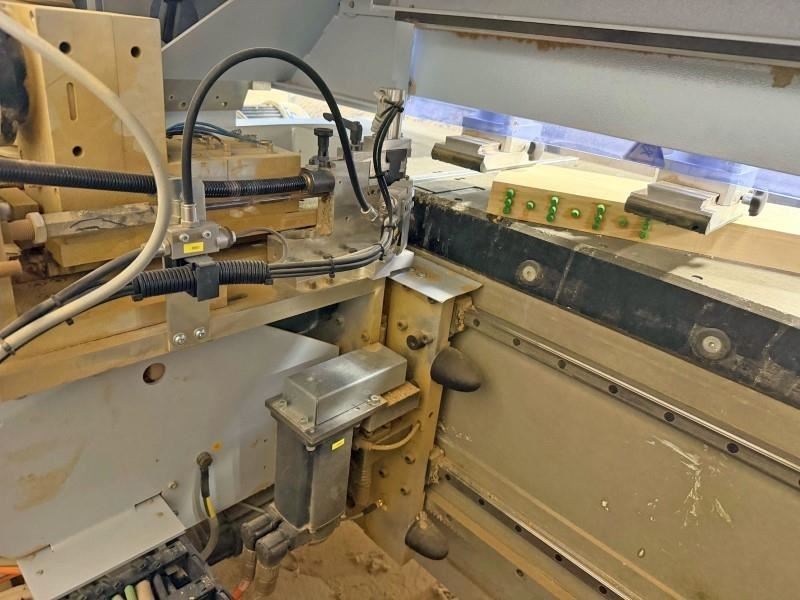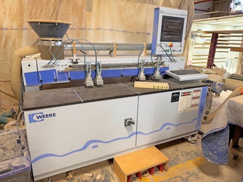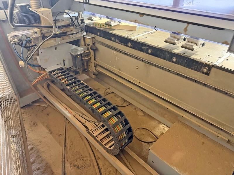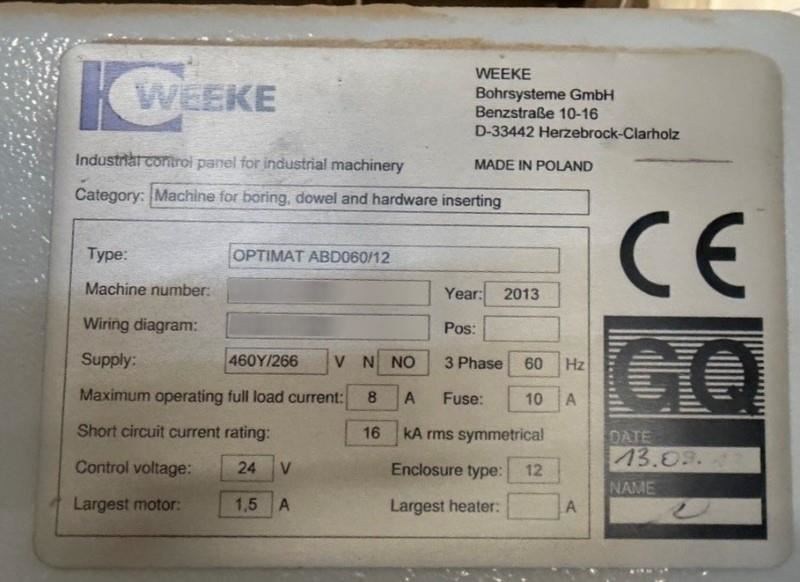 WEEKE ABD 060 CNC BORE, GLUE & DOWEL INSERTER: -- Specifications:(1) Horizontal drilling head with (3) Independent spindles on 32 mm centers, with servo control of "X", "Y" & "Z" Axis; (1) glue & dowel injector with glue flow control; (1) vibrating hopper dowel feeder. -- Working Capacity:Material size from 20 mm - 1,250 mm (.75" - 49") long, 50 mm - 800 mm (1.97" - 31.5") wide, 10 mm - 60 mm (0.4" - 2.4") thick.Machine is currently set up for 8 mm Dia., 30 or 35 mm long dowels (additional dowel sizes are optional). -- Work Area(2) Separate working fields with (4) pneumatic top clamps can process up to (4) parts independently on the left-hand, right-hand or center stops.Work can be loaded in (1) field while being machined in the other to allow fast production of varying parts. -- Operator Interface:PC Front-end with Homag Power Control PC 85T, WoodWOP 5.0 operating system with graphic programming & error messaging.17" TFT flat screen monitor, CD-RW drive, 1.44MB floppy drive, standard keyboard & mouse; Software allows program design with automatic mirror-image by use of an active center stop located 600 mm (23.6") from zero. -- Complete with: All manuals, documentation & program disk provided with machine. -- Actual Model is WEEKE ABD 060/12/NA.