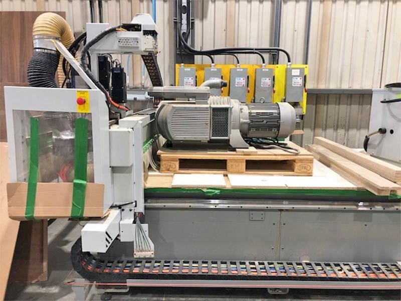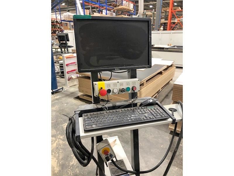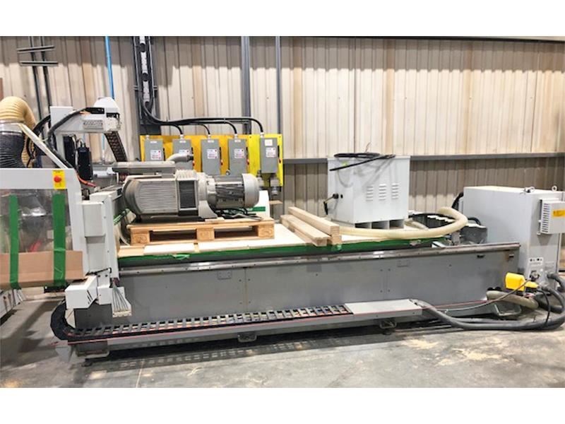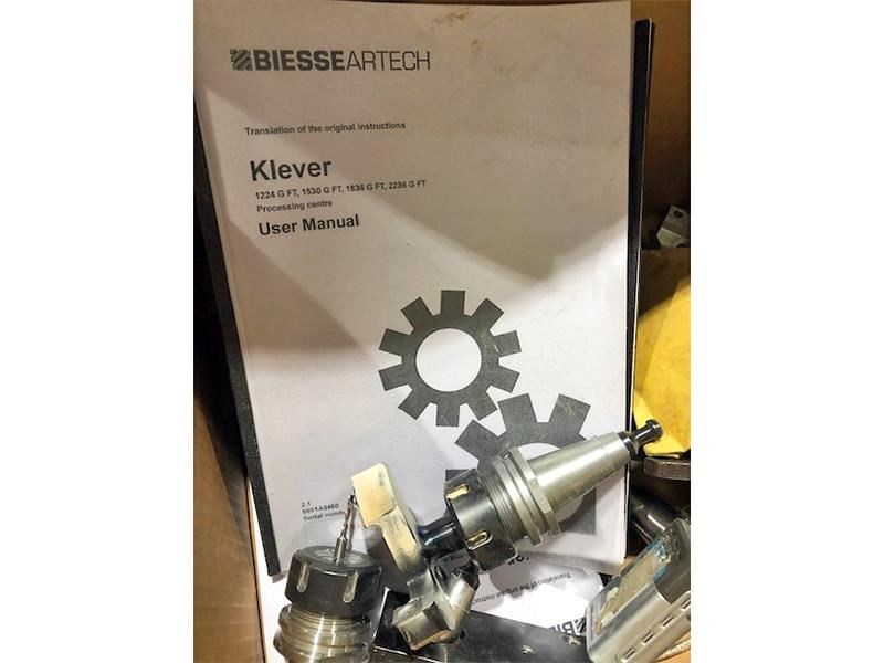 BIESSE KLEVER 1530 G FT FLAT TABLE MACHINE (W/ATC/BORING): -- Specifications: 5' x 10' "Bridge Gantry" machine with: "Aluminum "T"-Slot" table allows for Clamp Fixtures, or Vacuum Locking (requires a vacuum pump). -- Working Capacity: "X" Axis 120" (3,050 mm); "Y" axis 60" (1,550 mm); "Z" axis stroke is 10.2" (260 mm); max. material thickness 5.9" (150 mm). -- Positioning Speed:"X" & "Y" Axis 74 FPM (23 MPM); "Z" axis 41 FPM (13 MPM); "X" & "Y" Axes use a precision rack & pinion system; "Z" axis uses precision ball screws.All axes movement is on precision linear guides & ways and controlled by digital, brushless AC Servo motors; all motion components are maintained by an automatic lubrication system. -- Work Area:Flat table design with: "Aluminum" worktable that allows for automatic locking using T slots or possible vacuum locking (requires a vacuum pump)NOTE: Optional Vacuum Pump is included. -- (3+3) Manual flip reference stops in "Y" axis & (2) reference stops in "X" axis. -- Boring Unit:"BH 5" Boring head; (1) 2.5 HP (1.7 kW) - 4,000 RPM motor; (5) independent vertical spindles in "X" axis. -- Machining:(1) 12 HP (8.9 kW) Air-cooled HSD Electro-spindle with ISO 30 adaptor; variable speed from 1,000 - 24,000 RPM.(1) 7-Position tool rack; NC controlled digital presetting device for the measurement of the tool length. -- Operator Interface:PC Front-End with: BIESSE "BH 660" + "BiesseWorks" + Windows "WRT" Operating System;19" TFT flat screen monitor; Server, full keyboard & mouse all mounted on a mobile cart; Ethernet connection capabilities.BiesseWorks Graphic interface with: Assisted graphic editor used to program machining operations, parametric programming and guided creation of parametric macros.Import of CAD and other external software files in DXF and CID3 format; 3D simulation of the tool path, calculation of machining time & the ability to create rotate virtual faces. -- Complete with:(1) 10 HP (7.5 kW), 250 m³/Hr BECKER Vacuum Pump, automatic program update according to the tool length; Automatic Lubrication system for linear guides, pads and recirculating ball screw.; Handheld Pendant control: Universal Autotransformer for voltages between 200 - 600 V, 50 / 60 Hz. -- Actual Model is BIESSE KLEVER 1530 G FT