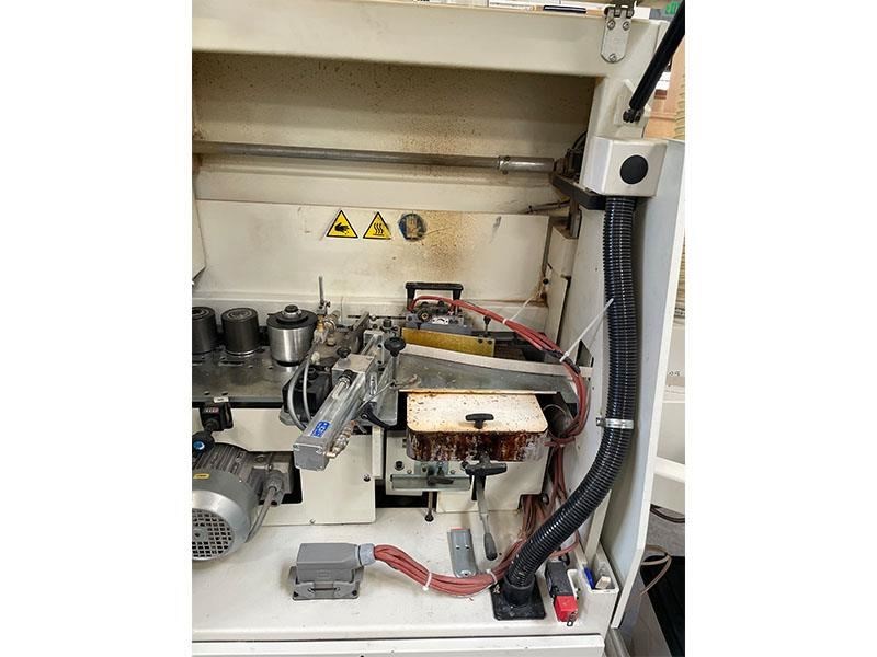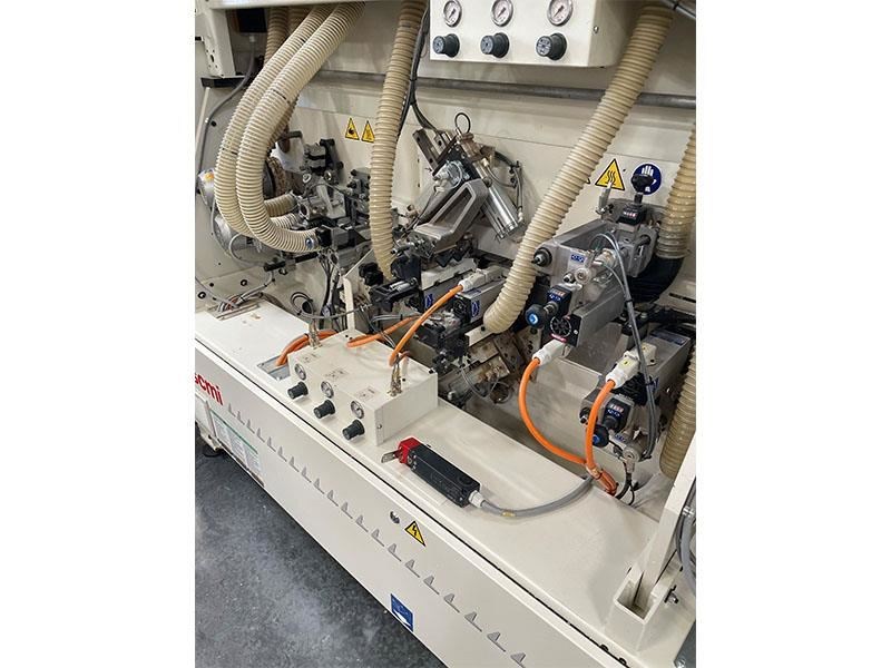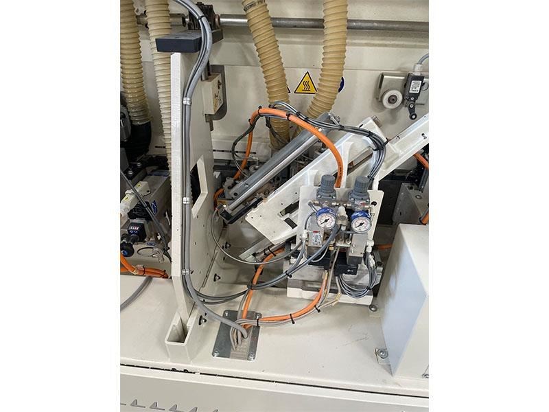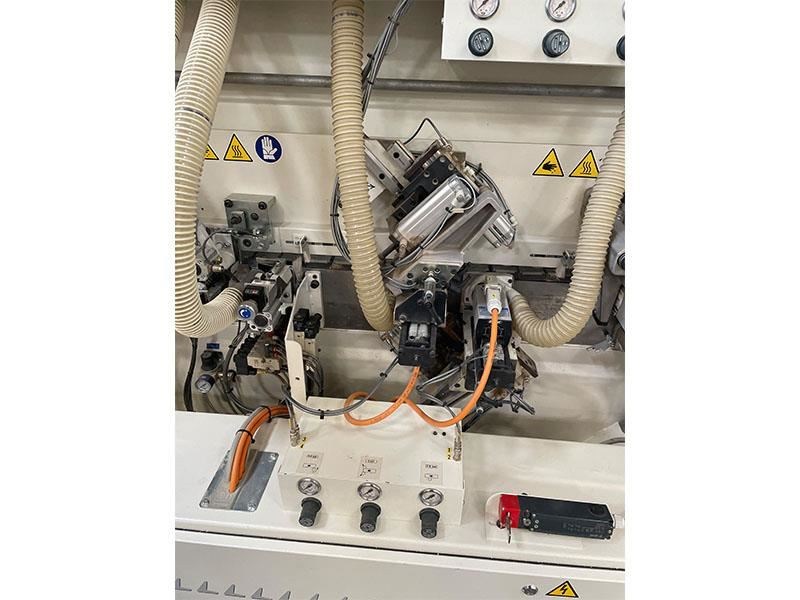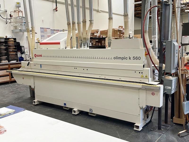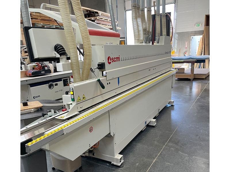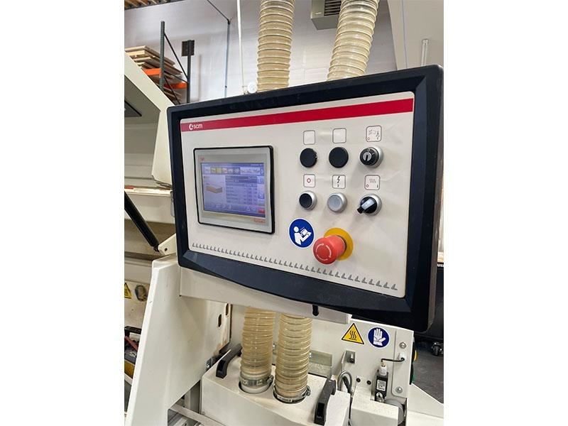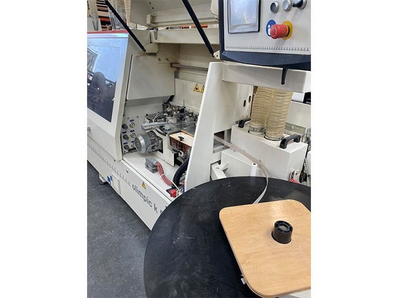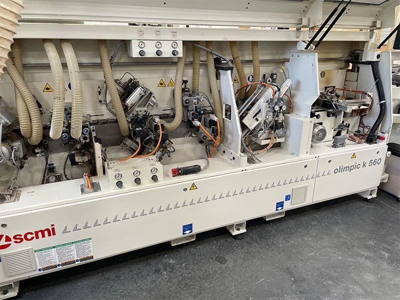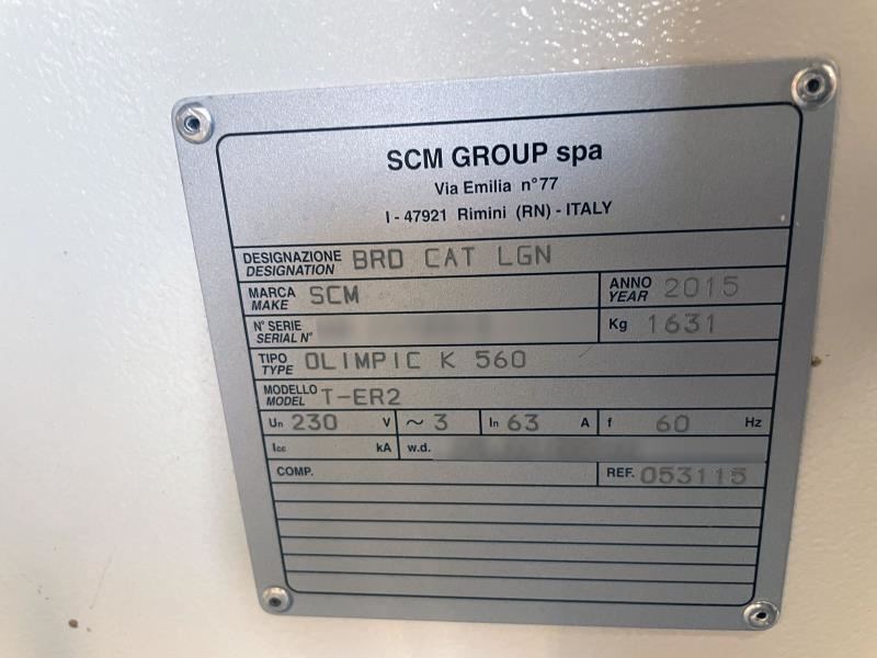 SCMI - OLIMPIC K 560 T-ER2. Edgebander (w/Premill & Corner Rounding) -- Specifications Edge Capacity: 0.4 to 6 mm (0.016 to 1/4") for strip feeding. -- Panel CapacityMin. panel width: 60 mm (2.375"); min. panel length: 140 mm (5-1/2").Min./max. panel thickness: 8 - 54 mm (0.375" - 2.125"); min. distance between panels: 600 mm (24").Equipped with: -- Premilling Station. (2) 2.0 HP (1.5 kW) motors; Servo controlled; to rectify/clean panels already sized. -- Adjustable Infeed Fence: Manually preset with digital indicator; pneumatic in/out positioning. -- Automatic Strip & Coil Feed Magazine. For straight edges; 3 mm guillotine for coils. -- Gluing Station: For EVA (Hot Melt) with quick-change/disconnect Teflon glue pot for fast glue tanks change if needed. Heat up time approx. 10 Min. -- Pressure Section. Manual digital positioning: Teflon coated pneumatic driven roller; (2) spring-loaded idle rollers.Workstations -- End Trimming Station. Front & rear: (2) 1/2 HP - 12,000 RPM Motors mounted on THK guides; swivels 0° - 15° for straight & angle cutting. -- Top & Bottom Trimming Unit. (2) 0.7 HP - 12.000 RPM motors; capable of tilting & pneumatic positioning for (3) settings: flush/bevel/radius trimming for quick setup. -- Corner Rounding Unit. With: (2) 0.8 HP Independent motors that slide on THK guides. -- Top & Bottom Profile Scraping Unit. Digital indicators; large dia. copy wheels for max. accuracy; pneumatic in/out positioning. -- Glue Scraping Unit. Eliminates any excess glue. -- Buffing Unit. Top/Bottom; (2) 1/4 HP - 2,800 RPM motors; tilting up to 12°.Operator Interface -- "STARTOUCH" Controller with Touchscreen display; capable of storing (100) programs. Machine automation by: PLC Function; encoder positioned in the panel feed track pinion.Diagnostics for a quick solution to errors; process statistics data: i.e., Number of pieces/edges and track feeding.Features & Complete with: -- 2-Speed feed speed of: 40 & 60 FPM (12 & 18 MPM); (1) 2-1/2 HP feed drive motor. -- 200 Hz Frequency inverter for all trimming units. -- Servo controlled, adjustable top hold-down pressure beam. -- Auto. panel spacer to eliminate premature loading -- Anti-adhesive spray. -- Full sound enclosure cover & outboard panel support. -- Actual Model: SCM - OLIMPIC K 560 T-ER2