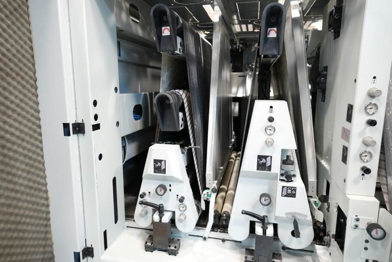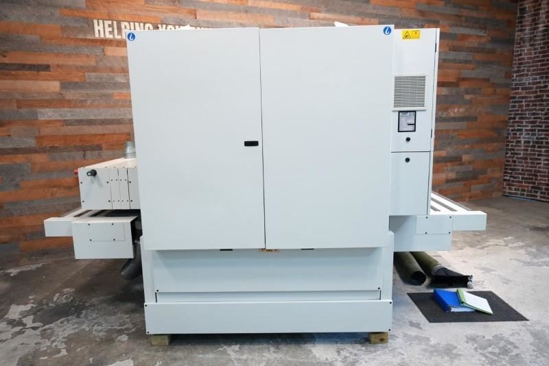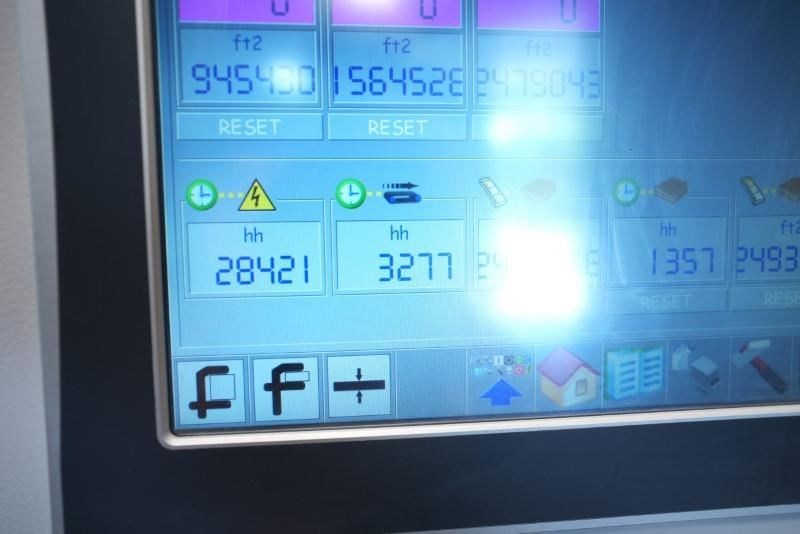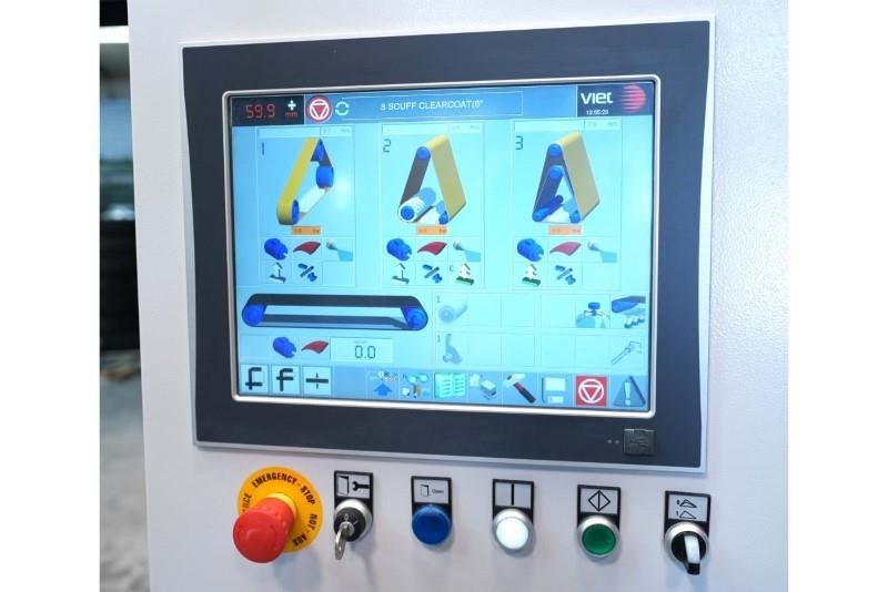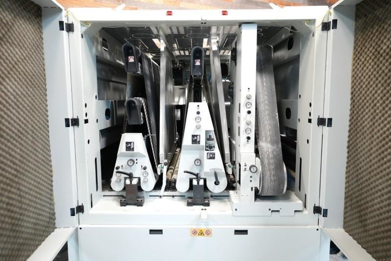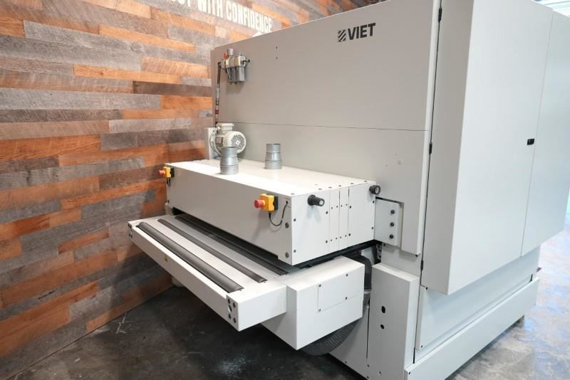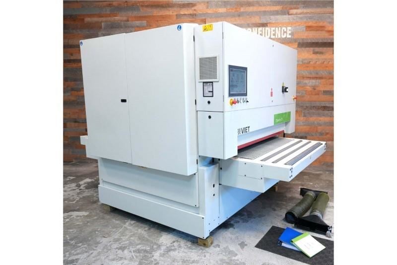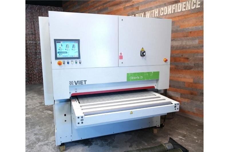 Biesse Viet Opera 5-3.3 CKF 53″ wide calibrating sander53" Width cap, Crossbelt Platen, PlatenHeadConfiguration1St Head : Variable speed (.2-16 m/s), segmented platen, 6″ wide cross belt2nd Head : Variable speed (3-13 m/s), segmented platen, 6″ helical grooved combination head, powered by a 22 kw motor that also has air wands3rd Head: Variable speed (2.8-12.5 m/s), segmented platen head, with a chevron belt, powered by a 15 kw motor with air wands.4 Station : Scotch-Brite head powered by a 1.1 KW motor after which you will find an an antistatic bar followed by air blowers.Specifications -- 3,277 run (conveyor) hours. This is a very loaded, lower hour, very hard to find wide belt sander. -- Constant pass line with a 53″ width capacity and a 3 mm-200 mm or 7.87″ thickness capacity. -- To the right above the infeed of the machine is a digital thickness calibration unit. Equipped with & Features -- The vacuum bed is powered by a 4.6 kw blower that is located under the sander to save space. -- The feed-mat is powered by a 4 kw motor with variable speed via a VFD with feed speeds from 4 to 18 m/min. -- The feed-mat also has air wands underneath. All the controls on this Opera are up front via a touch screen. -- All the controls on this Opera are up front via a touch screen.