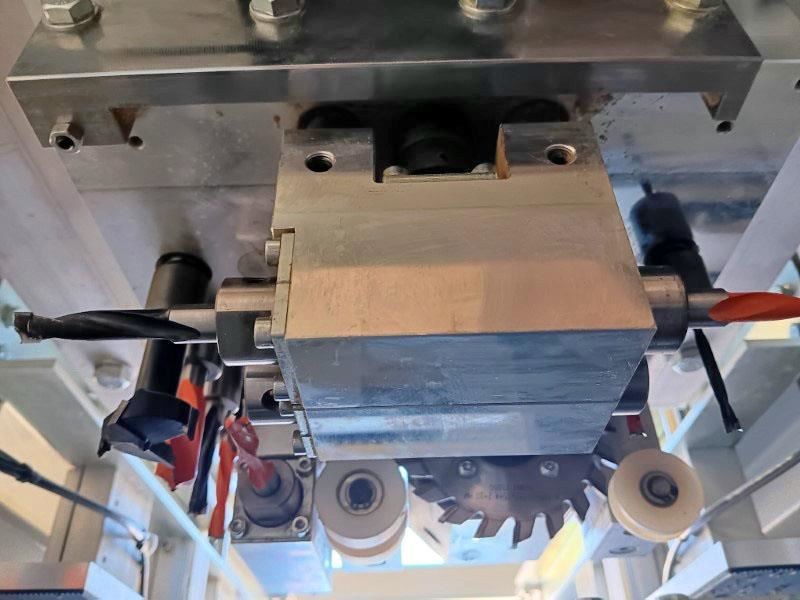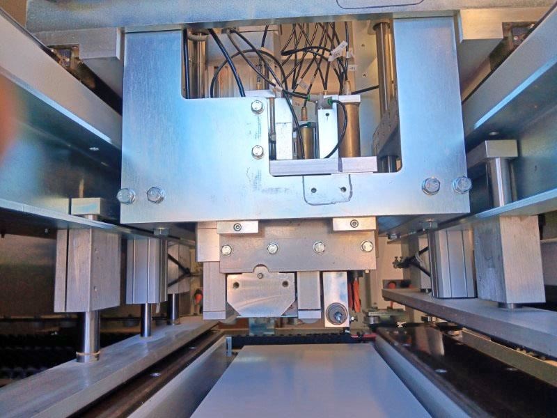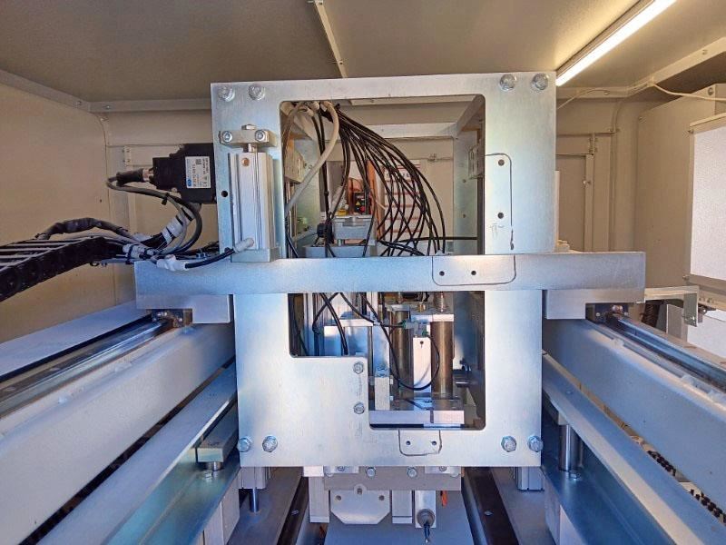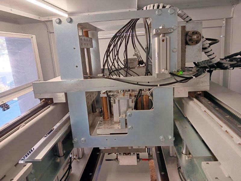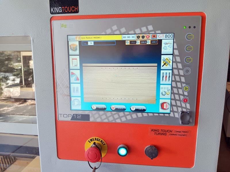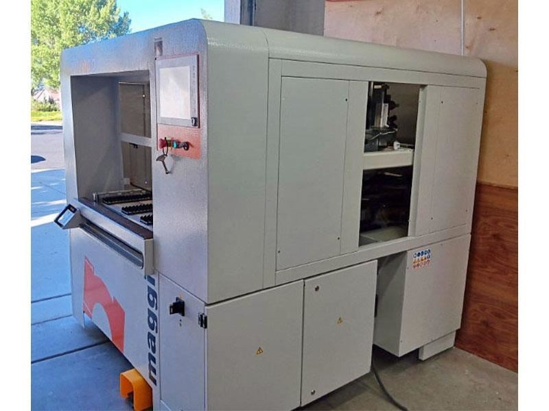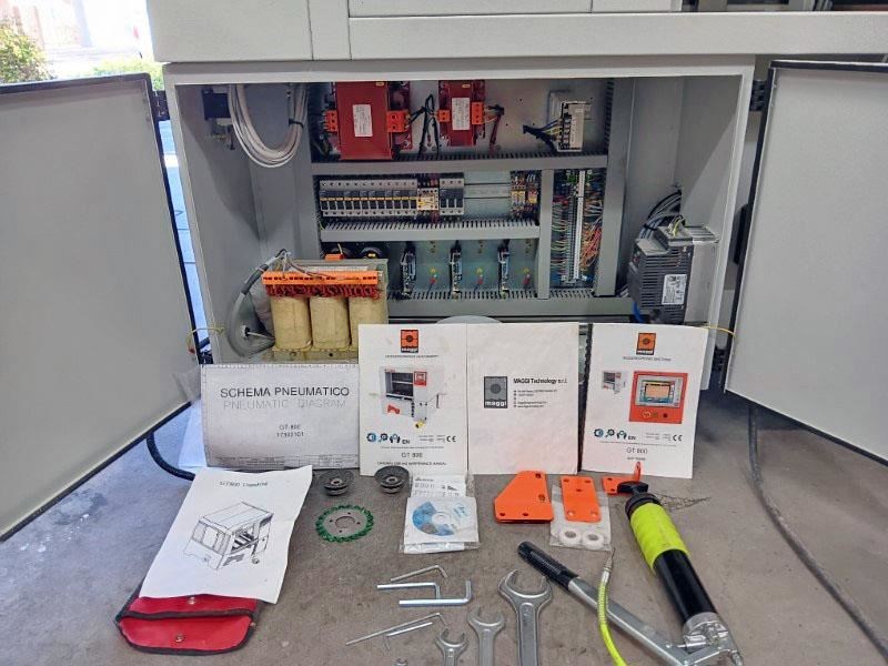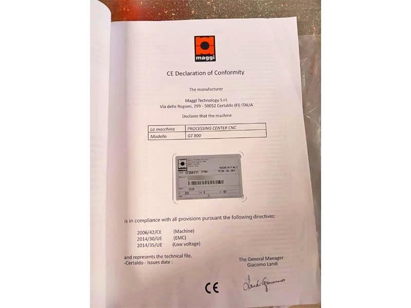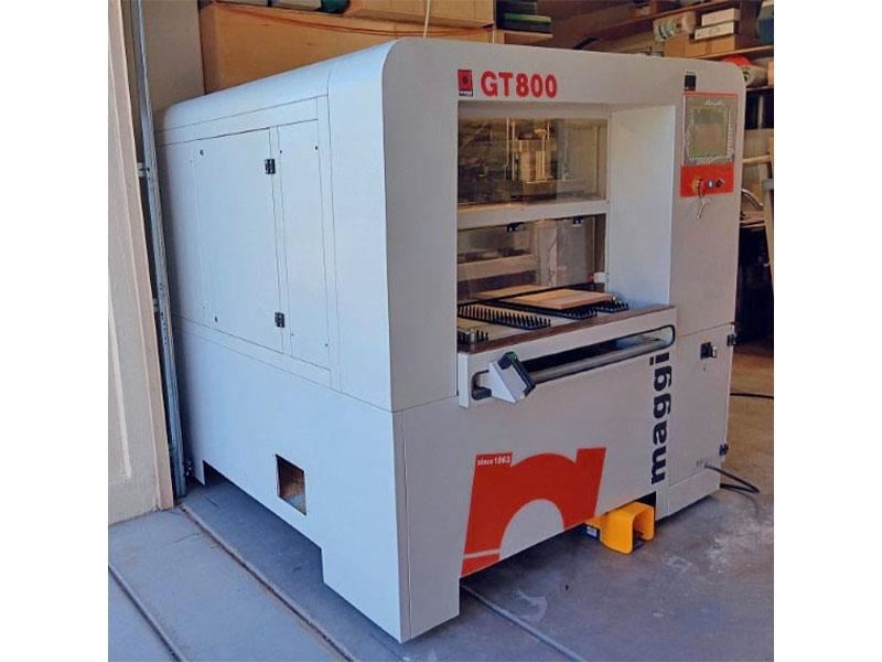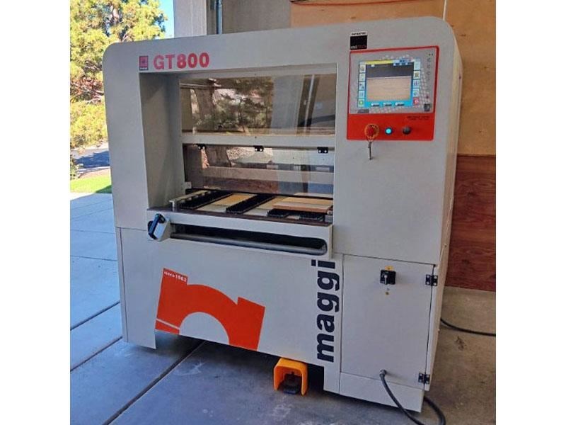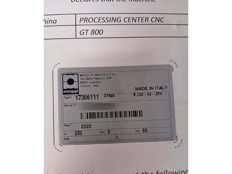 MAGGI GT 800 CNC MACHINING CENTER: -- SpecificationsFlexible "Vertical/Horizontal" Boring & Grooving Machining Center that can reach movement speeds of: 82 FPM (25 MPM) in "X" & "Y" axis & 49 FPM (15 MPM) in "Z" axis with total safety. -- Working FieldMax. part size for "X" axis is virtually infinite; "Y" axis 31.5" (800 mm); max. part thickness 2" (50 mm). Min. part size for "X" axis is 9.84" (250 mm); "Y" axis 3.93" (100 mm); min. part thickness of 0.39" (10 mm).Panel End/Edge Reader for perfect panel positioning/placement. -- Boring Unit:Suitable for drilling on face & sides of panels including Holes for dowels, hinges, KD fittings, and shelf holes.(1) Boring block with: 3 HP (2.2 kW) - 3,400 RPM Motor; (7) vertical spindles with: (4) Spindles in "X" axis & (3) spindles in "Y" axis.(1) Horizontal spindles with: (1+1) In "X" axis for top & bottom edge boring.Boring Capacity: 0 to 800 mm (31-1/2") with any spindle. -- Operator InterfacePC Front End with: Extremely intuitive user interface with up to (1,000) program storage space; real-time multitask processing.12" TFT "Touchscreen "Monitor; soft touch keypad & industrial mouse; RS-232 Serial ports, USB ports; (1) CD ROM drive. -- Complete with:Pneumatic part clamping roller devices; auto lubrication system; sound enclosure & safety devices. -- Actual Model is MAGGI GT 800