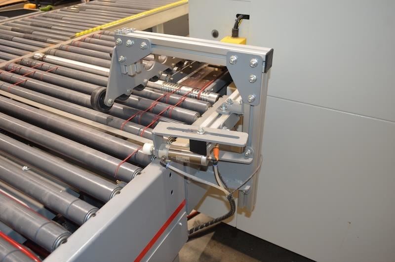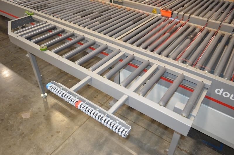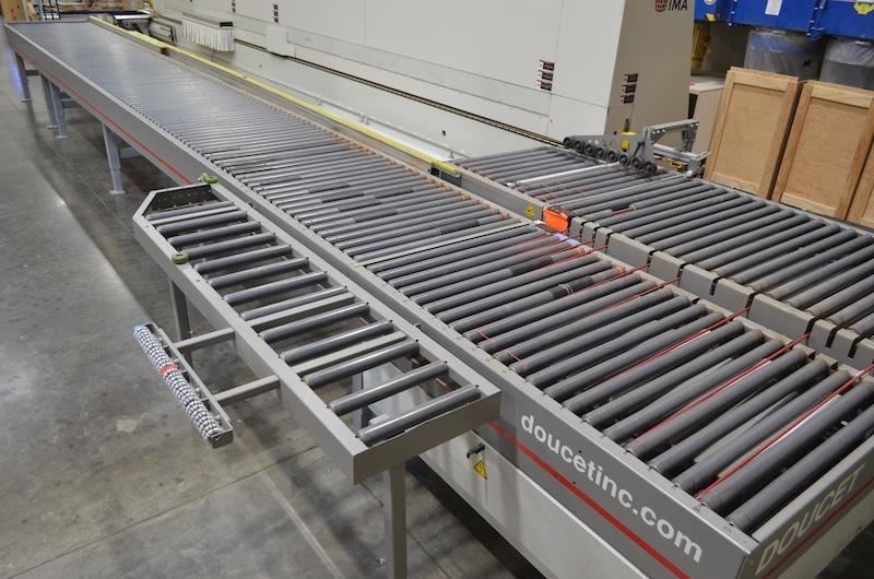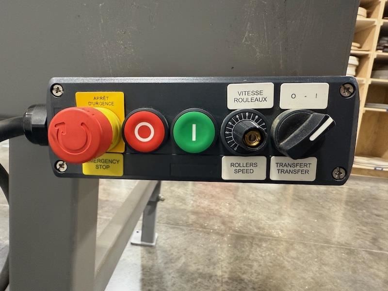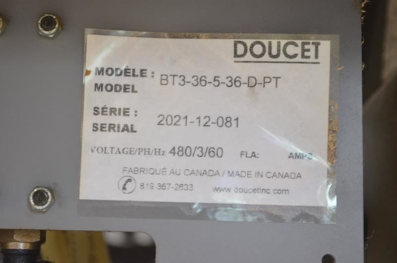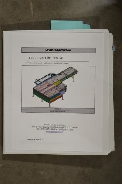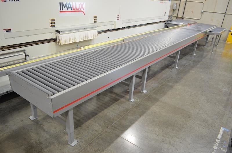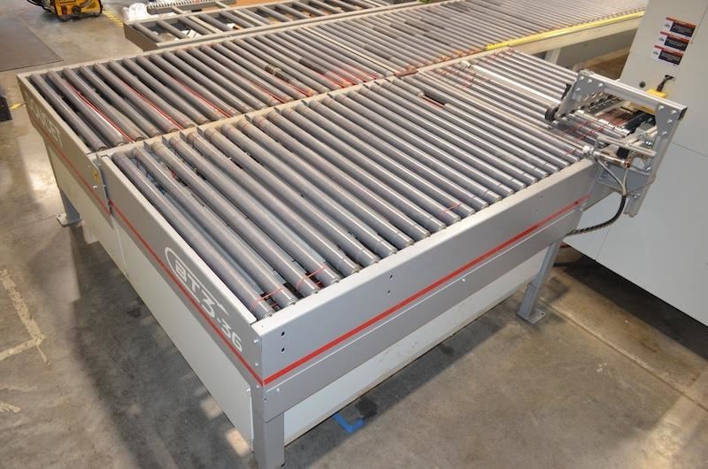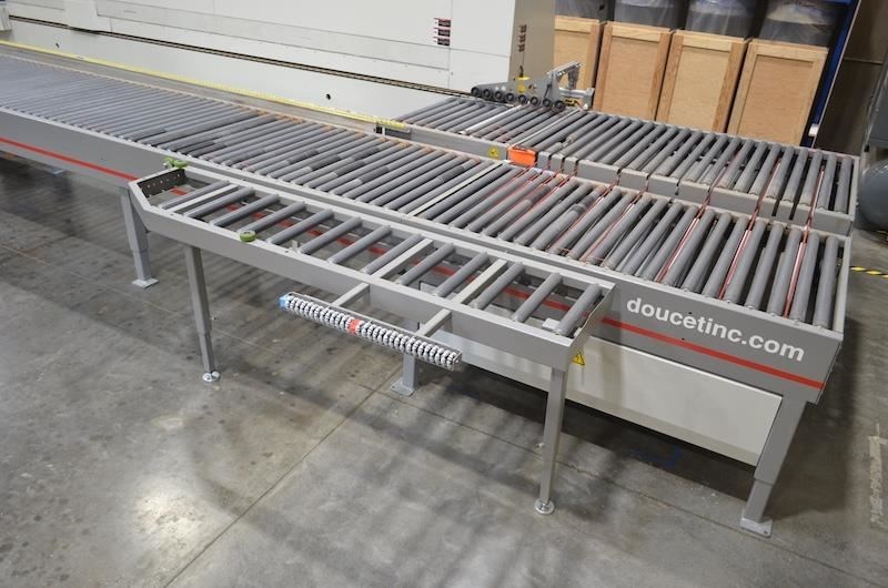 DOUCET BT3-36-5-36-D-PT Return Conveyor for EdgebandersSpecifications: -- Left-hand feed, with Right-hand return. -- Min. part size 4" x 12". -- Max. panel size (with operator assistance supporting then turning panels) 52" x 96".Equipped with: -- 33'’ L Motorized infeed roller conveyor section. -- 40"; W x 5’ L x 38"; H Receiving table, with Automatic/Manual height adjustment 2". -- (9) 3/8"; Dia. transfer belts. -- 36"; W x 5’ L x 36"; H Return table. -- 36"; W x 28’ L x 36"; H Return conveyor. -- All rollers 1-7/8"; Dia. covered line shaft on 3"; centers.Complete with: -- "PT 90" 15-1/2"; W x 6’ L 90° Panel Turner. -- Operations Manual.Overall Dimensions: -- 405" x 126" x 49" H.