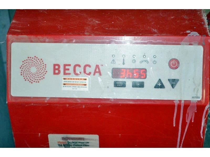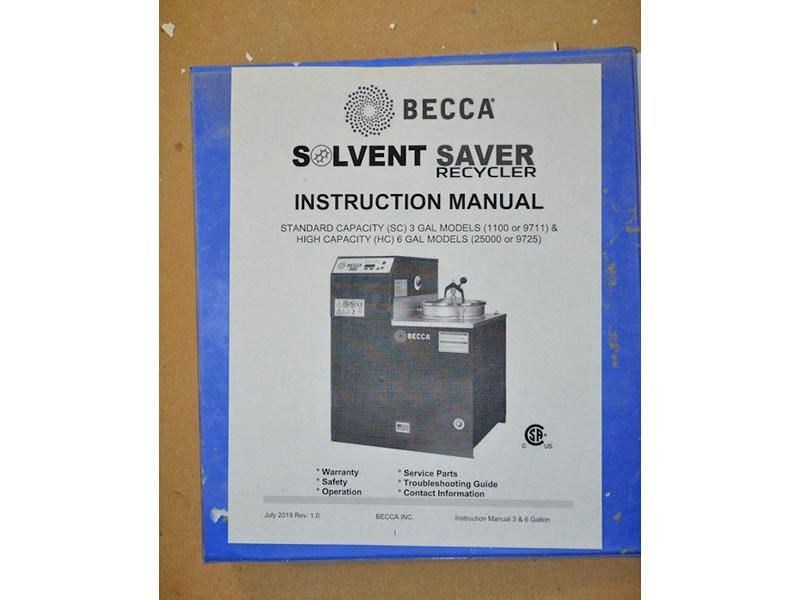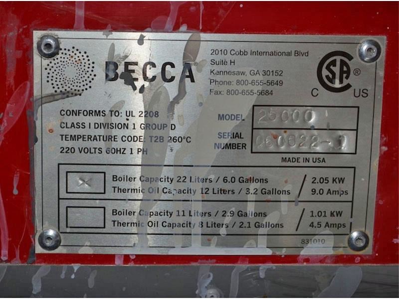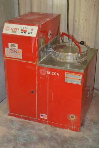 BECCA 25000 22 liters / 6 Gallon Cap. 2.,05 kW Fully-Automated Solvent Recycling SystemSpecifications: -- Processes Conventional, Alternative, & Waterborne Solvents. -- Boiler cap. 6 Gallons, Thermic oil cap. 3.2 Gallons. -- Heating chamber size approx. 14"; Dia. x 14"; D. -- Solvent recovery rate > 90%. -- Operating temperature 140° - 392° F. -- Operating pressure: -0.223 - 1 bar Absolute, -0.776 - 0 bar Relative. -- Adjustable cycle time 3 - 5 Hrs. Equipped with: -- Dual skin AISI 304 stainless steel heating chamber, with AISI 304 Stainless steel pressure relief lid & Replaceable solvent-resistant thermal gasket seal. -- AISI 304 Stainless steel boiler, with Indirect Thermic oil bath & (2) Heating elements. -- Fan-cooled copper condenser system, with Aluminum non-sparking fan blade. -- Temperature/Cycle Time Digital touchpad control, with LED Display, Self-diagnostic system, Liquid & oil temperature primary electronic & back-up mechanical sensors.Complete with: -- Installation, Start-Up & Operator's Guides.