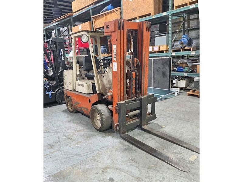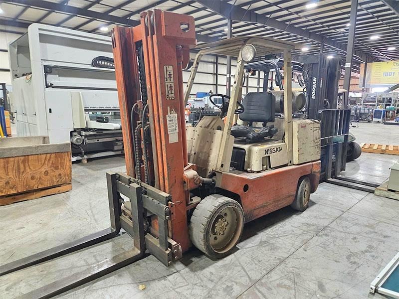 5,800 LB. Capacity at 24" load center. 3 stage mast with raised height of 169". 42" forks with a set of 6' extensions included. This fork lift has (2) forward speeds and side shift. NOTE: Runs great but needs brakes.